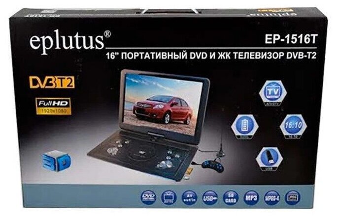 Портативный DVD-плеер 16" Eplutus EP-1516Т c цифровым тюнером DVB-T2 имеет широкий спектр воспроизводимых файлов, помимо CD и DVD дисков, DVD-плеер также воспроизводит информацию с карт памяти SD и USB носителей. ЕР-1516Т снабжен встроенным TV-тюнером стандарта DVB-T2, что позволяет ему распознавать цифровые каналы эфирного телевидения без дополнительных приборов и устройств,а диск с играми, который входит в комплект, непременно порадует Ваших детей.