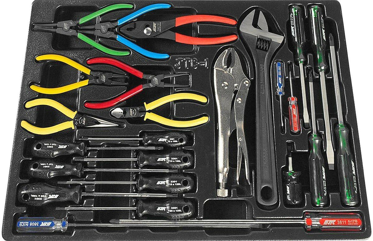 Набор инструментов JTC JTC- для тележки инструментальной-3931, 1-я секция, 25 предметов - используется для проведения ремонтных работ автомобиля. Инструменты комплекта изготовлены из прочной стали, стойкой к большим нагрузкам. Рукоятки изделий обеспечивают надежное удержание и комфорт во время применения. Набор из 25 предметов поставляется на подложке для инструментальной тележки JTC-3931.Преимущества Набор соответствует требованиям международного стандарта DIN Эргономичные рукоятки удобно лежат в руке и не проскальзывают Ложемент надежно фиксирует содержимое – инструменты не потеряются