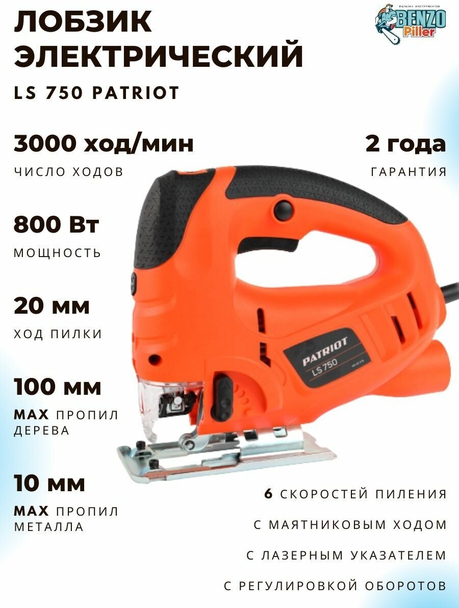 Лобзик PATRIOT , 800 Вт, 3000 ход/мин, маятниковый ход Электрический лобзик PATRIOT предназначен для прямой и фигурной резки дерева, пластика, металла и других материалов. Особенности Фиксатор кнопки включения упрощает продолжительную работу. Есть функция наклона подошвы для пропила под углом. Для удобства обработки различных материалов частота хода регулируется. Лазерный маркер и диодная подсветка улучшает видимость линии реза. Пластиковый щиток обеспечивает безопасность пользователя при работе.
