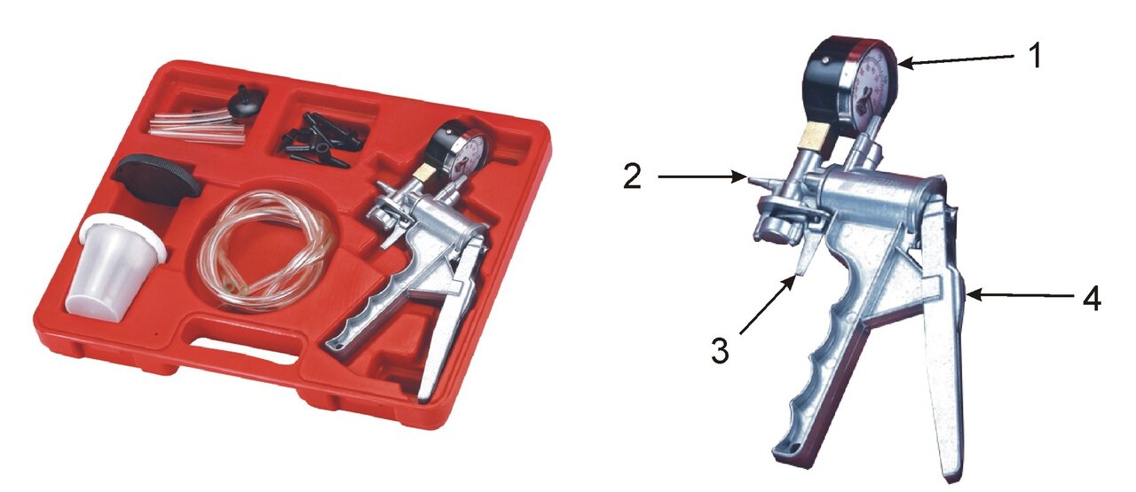 В комплекте: Вакуумный ручной насос. Стакан-накопитель. Рабочая крышка. Крышка-заглушка. 4 гибкие трубки 1/2". 1 гибкая трубка 5/32". Адаптер для выпуска воздуха из тормозной системы. Резиновая присоска. Упаковка: прочный переносной кейс.