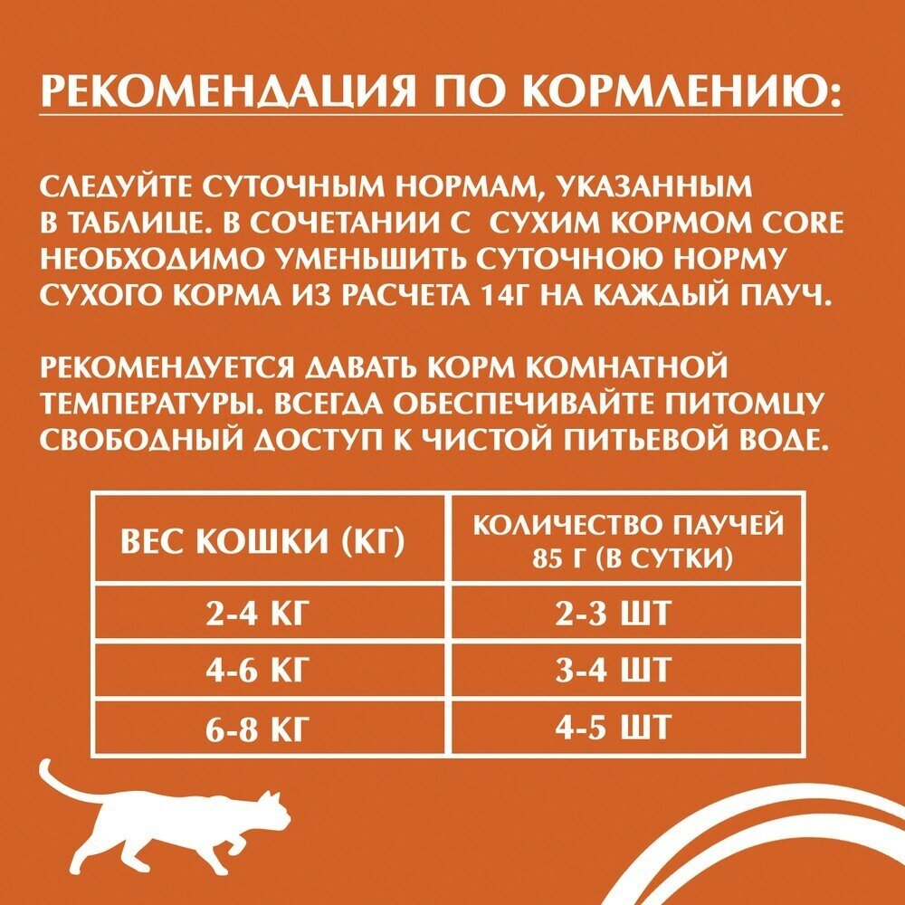 Беззерновые паучи CORE Tender Cuts cозданы с учётом естественных потребностей домашних питомцев. Гарантированное содержание высококачественного натурального белка животного происхождения в рационах. С помощью правильных углеводов, овощей, фруктов и пребиотиков CORE обеспечивает сбалансированное натуральное беззерновое питание для кошек. Преимущества влажных рационов CORE: Оптимальный баланс белков, жиров и углеводов. До 58% свежих мясных ингредиентов. Сочетание нескольких источников белка. Большое количество витаминов, минералов и антиоксидантов для поддержания иммунитета. Легкоусвояемая формула с клетчаткой для здоровой микрофлоры. Беззерновое питание. Не содержит пшеницу, кукурузу и сою. Подходит для животных с чувствительным пищеварением. Жирные кислоты Омега-З и Омега-6 в оптимальном соотношении для здоровья кожи и шерсти.
