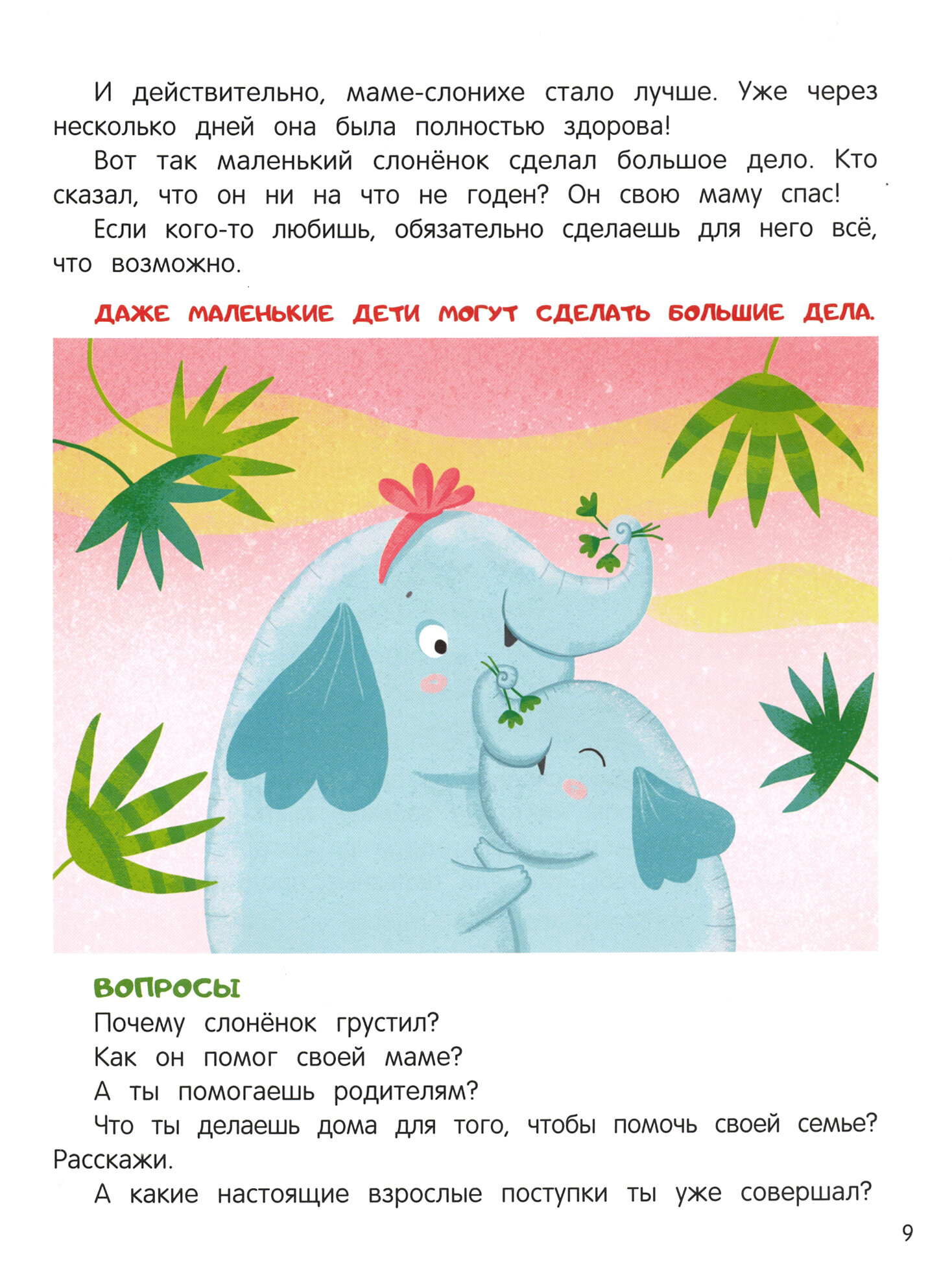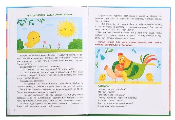 Кроме полезных сказок малыша ждут вопросы и задания, которые можно выполнять вместе, делая атмосферу семьи уютной и радостной.
