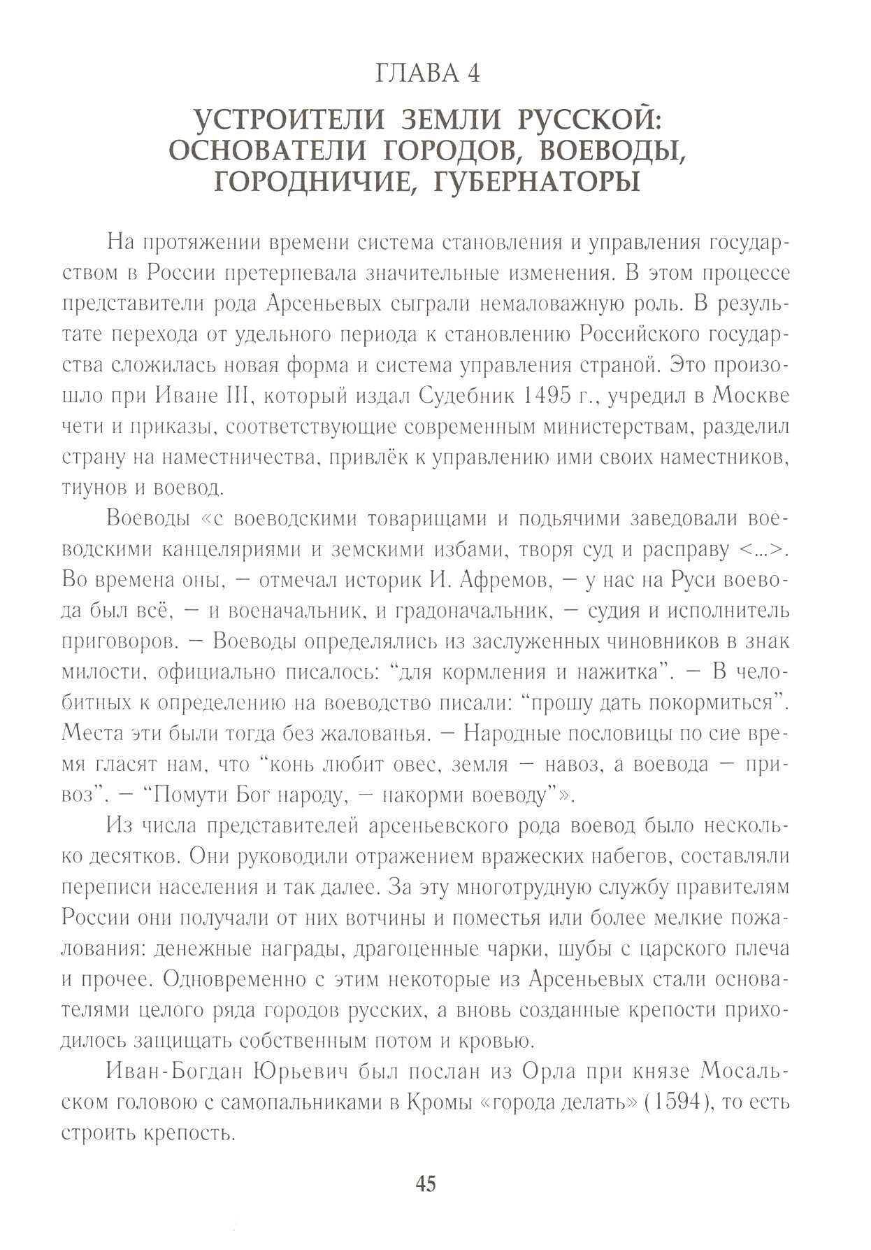 Книга посвящена старинному дворянскому роду Арсеньевых, насчитывающему двадцать поколений. Арсеньевы принимали героическое участие в защите русских рубежей от многочисленных нашествий иноземцев, внесли значительный вклад в развитие просвещения, науки, различных аспектов политической, экономической и культурной жизни русской столицы и русской провинции, проявили себя в области светской и церковной благотворительности. Издание содержит подробную родословную Арсеньевых.