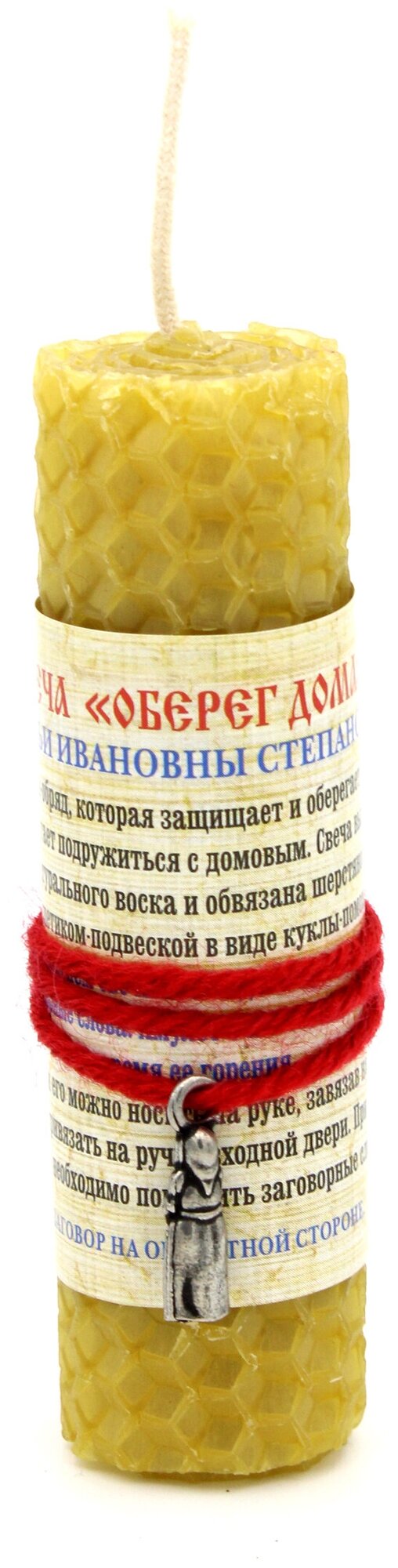 Свеча обряд, которая защищает и оберегает дом. Помогает подружиться с домовым. Свеча выполнена из натурального воска и обвязана шерстяной нитью с амулетиком-подвеской в виде куклы-помощницы. Над пламенем свечи необходимо произнести особенные заговорные слова. Амулет с ниточкой должен лежать возле свечи во время ее горения. Потом его можно носить на руке, завязав на сеть узлов или привязать на ручку входной двери. При завязывании узлов необходимо повторить заговорные слова. Размер: 80 x 25 x 27 мм.