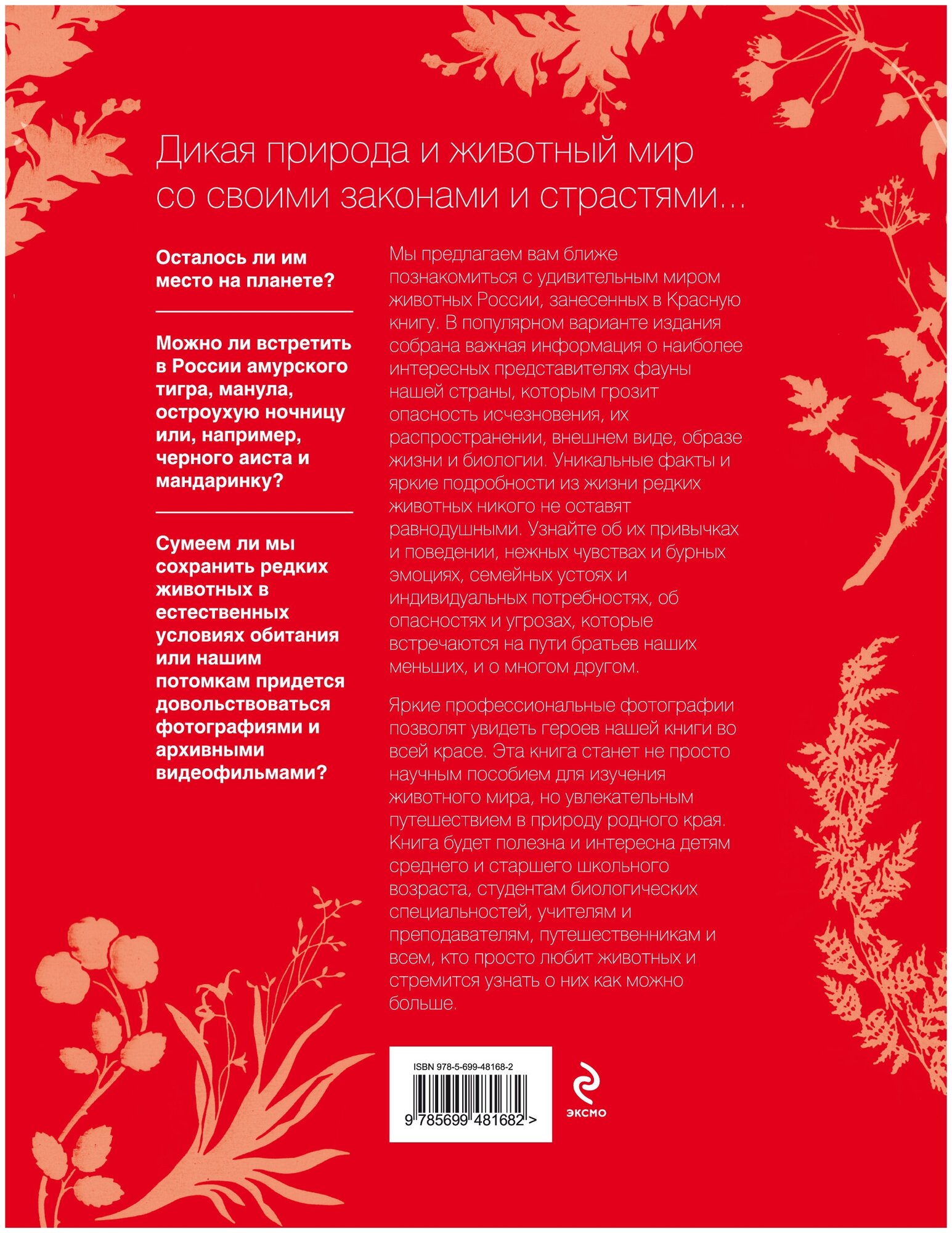 Познакомьтесь поближе с удивительным миром животных России, занесенных в Красную книгу. Здесь собрана важная информация о наиболее интересных представителях фауны нашей страны, которым грозит опасность исчезновения, их распространении, внешнем виде, образе жизни и биологии. Уникальные факты и яркие подробности из жизни редких животных никого не оставят равнодушными. Узнайте об их привычках и поведении, нежных чувствах и бурных эмоциях, семейных устоях и индивидуальных потребностях, об опасностях и угрозах, которые встречаются на пути братьев наших меньших и о многом другом. Яркие профессиональные фотографии позволят увидеть героев нашей книги во всей красе. 3-е издание.