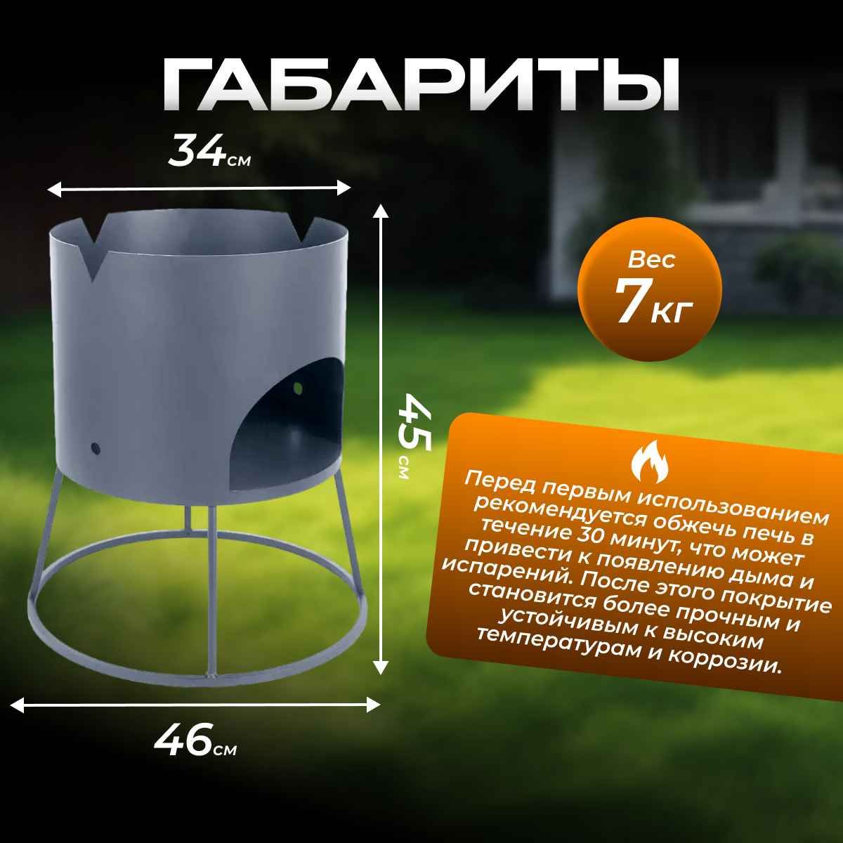 Простая, недорогая печь под казан на 6- 8 литров. Характеристики: Высота 450 мм, Диаметр основания 460 мм, Диаметр под казан 340 мм. Вес 7 кг. Казан приобретается отдельно. Печь под казан малая предназначена для приготовления пищи под открытым небом. Благодаря своим компактным размерам и малому весу удобна для перевозки на природу. Казан, максимально утопленный в данную печь, имеет безупречный прогрев стенок, что очень важно для качественного приготовления блюд. Перед первым использованием печи под казан по назначению необходимо закрепить покрытие – обжечь в течение примерно 0,5 часа. Внимание! Покрытие – термостойкая кремнийорганическая эмаль – набирает прочность только после первого обжига. При обжиге возможно дымление и испарение растворителя, оставшегося в эмали. Внешний вид товара может незначительно отличаться от фотографий на сайте.
