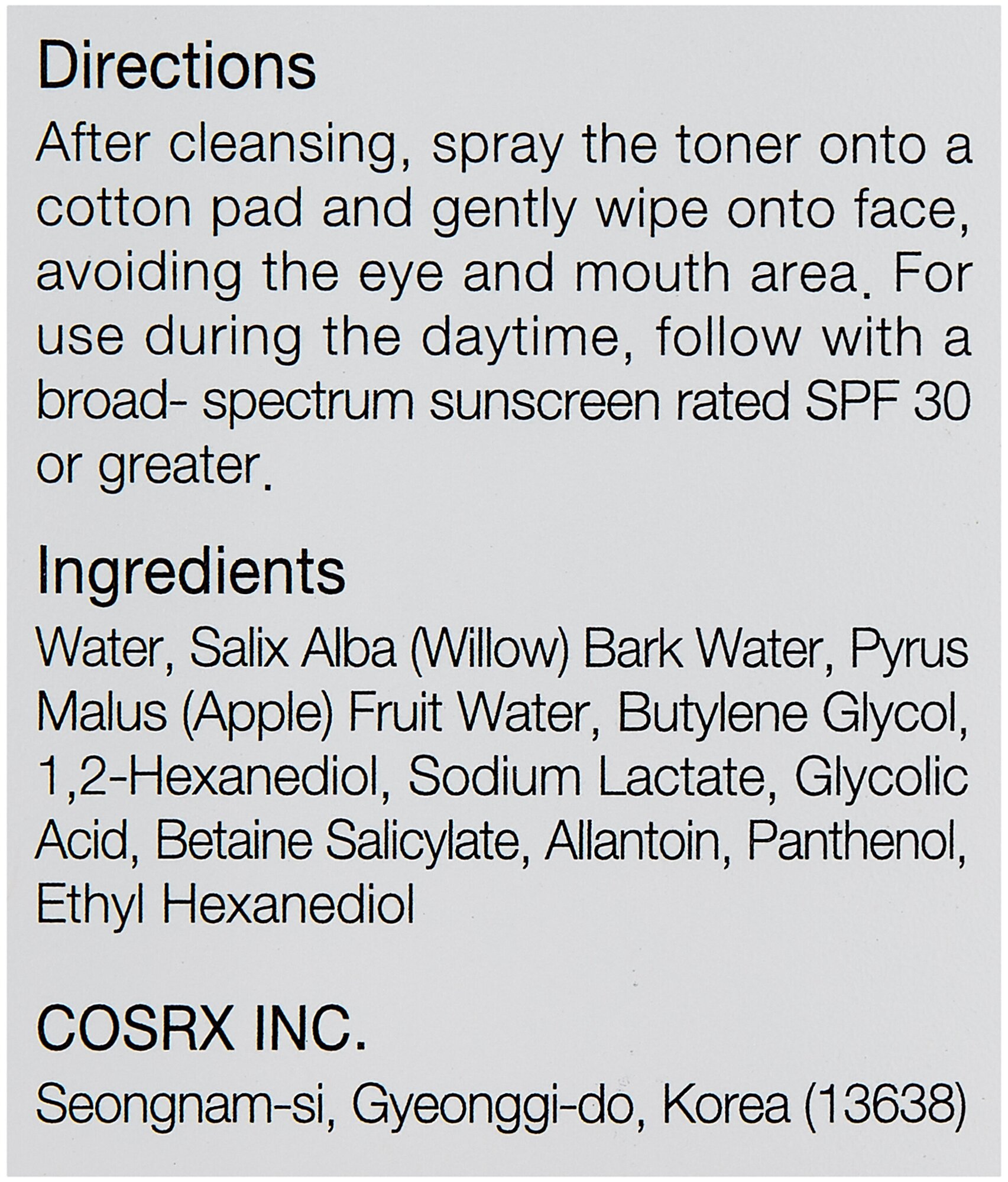 | Состав | mineral water, salix alba (willow) bark water, pyrus malus (apple) fruit water, butylene glycol, 1,2-hexanediol, sodium lactate, glycolic acid, betaine salicylate, allantoin, panthenol, ethyl hexanediol |