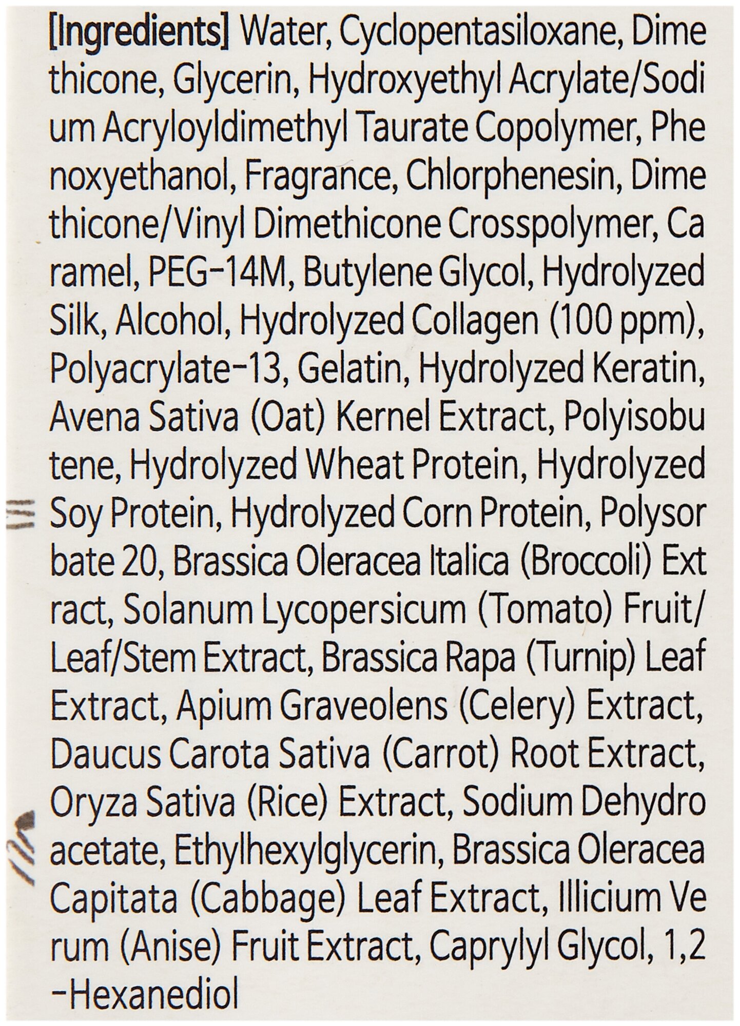 | Состав | water, cyclopentasiloxane, dimethicone, peg-14m, glycerin, dimethicone/vinyl dimethicone crosspolymer, silk amino acids, hydrolyzed collagen, hydrolyzed keratin, gelatin, avena sativa (oat) kernel ext water, cyclopentasiloxane, dime thicone, glycerin, hydroxyethyl acrylate/sodium acryloyldimethyl taurate copolymer, phe noxyethanol, fragrance, chlorphenesin, dime thicone/vinyl dimethicone crosspolymer, caramel, peg-14m, butylene glycol, hydrolyzed silk, alcohol, hydrolyzed collagen (100 ppm), polyacrylate-13, gelatin, hydrolyzed keratin, avena sativa (oat) kernel extract, polyisobutene, hydrolyzed wheat protein, hydrolyzed soy protein, hydrolyzed corn protein, polysor bate 20, brassica oleracea italica (broccoli) extract, solanum lycopersicum (tomato) fruit/ leaf/stem extract, brassica rapa (turnip) leaf extract, apium graveolens (celery) extract, daucus carota sativa (carrot) root extract, oryza sativa (rice) extract, sodium dehydro acetate, ethylhexylglycerin, brassica oleracea capitata (cabbage) leaf extract, illicium verum (anise) fruit extract, caprylyl glycol, 1.2-hexanediol |