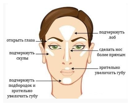 Кистью или спонжем нанести хайлайтер легкими штрихами на T-зону, зону скул и другие зоны, которые необходимо выделить и подсветить, затем равномерно растушевать. Можно наносить на область декольте, плечи для придания им рельефности, объема, маскировки морщин и т. д.