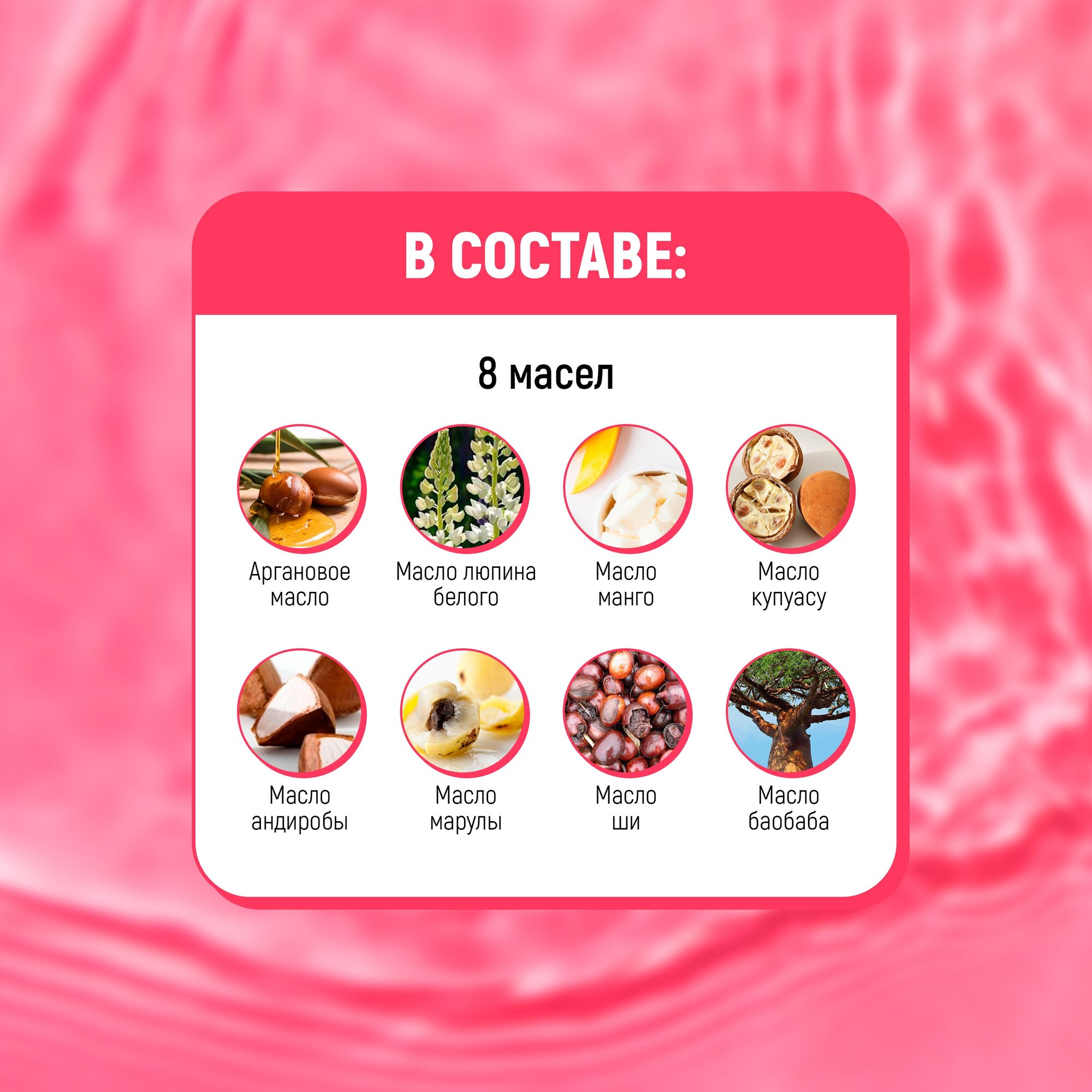 Состав: вода, цетеариловый спирт, диметикон, экстракт семян сливы, экстракт корня алтея лекарственного, экстракт ромашки, экстракт кникуса аптечного (чертополоха), экстракт листьев шалфея, экстракт цветов/листьев тимьяна, экстракт цветов розы дамасской, экстракт цветов календулы, экстракт цветов полыни горькой, экстракт цветов лаванды, экстракт листьев розмарина, экстракт цветов гибискуса, экстракт плодов гуайавы, экстракт плодов маракуйи, экстракт плодов питахайи, PCA этил кокоил аргинат, масло семян макадамии, масло семян люпина белого, масло семян купуасу, масло семян манго, дипентаэритритил три-полигидроксистеарат, этилгексил пальмитат, бис-бегенил/изостеарил/фитостерил димер дилинолеил димер дилинолеат, экстракт семян тунга молуккского, масло семян баобаба, аргановое масло, масло андиробы, масло семян марулы, изостеарат гидрогенизированного касторового масла, бис-(полиглицерил-3 оксифенилпропил) диметикон, глицерил три-гидрогенизированный розинат, стеартримониум бромид (< 0,1%), дикокодимониум хлорид, цетримониум хлорид (< 0,1%), изопропиловый спирт, бутилен гликоль, глицерин, токоферол(витамин Е), этидроновая кислота, феноксиэтанол (< 1%), парфюмерная композиция, карамель.