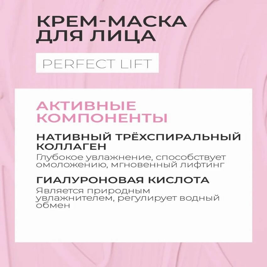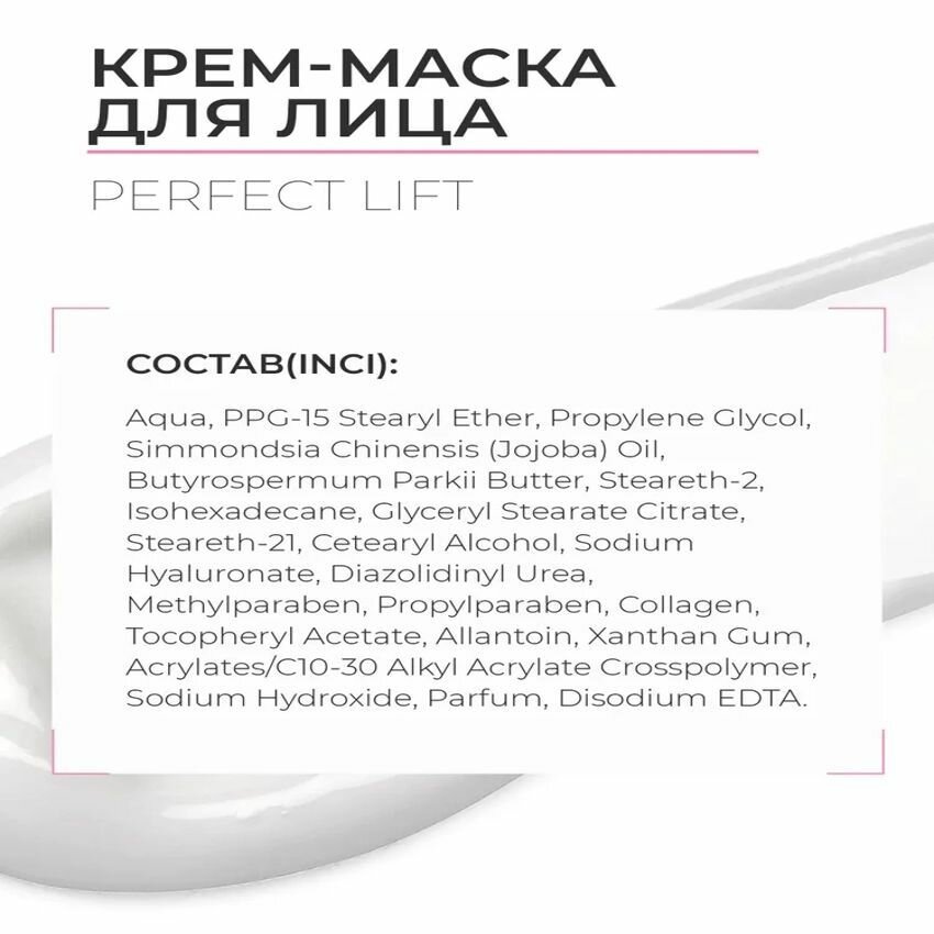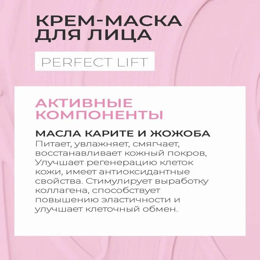 Крем-маска Perfect Lift предназначена для ухода за любым типом возрастной кожи. Маска устраняет признаки возрастных изменений, усталости, увлажняет, успокаивает, возвращает коже ощущение комфорта, омолаживает, разглаживает морщины, укрепляет тургор, восстанавливает поврежденные клетки.