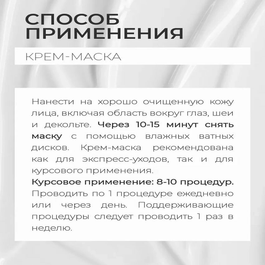 Результат применения: кожа мягкая, увлажненная, подтянутая.