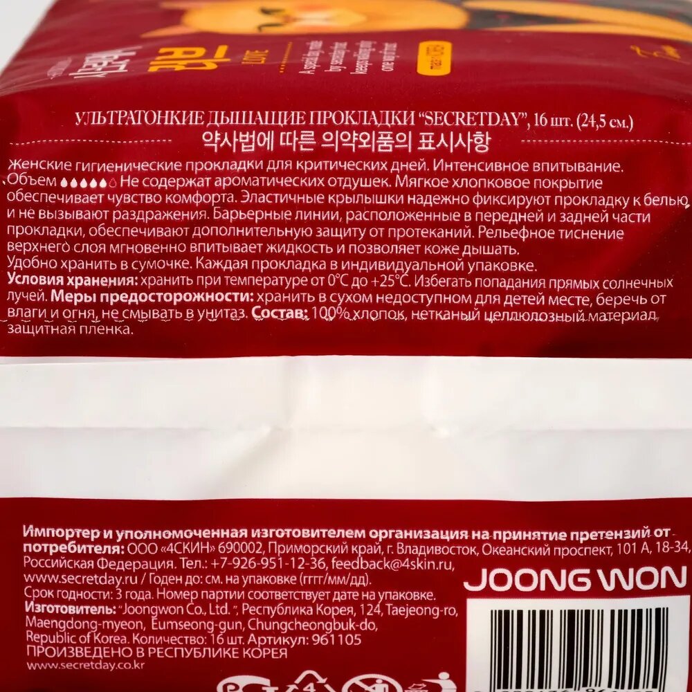 Secret Day Ультратонкие дышащие органические прокладки 16 шт. (245 см) (Secret Day ) (S961105) (размер: M)