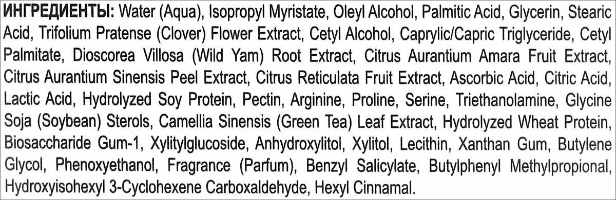| Состав | water (aqua), isopropyl myristate, oleyl alcohol, palmitic acid, glycerin, stearic acid, trifolium pratense (clover) flower extract, cetyl alcohol, cetyl palmitate, caprylic/capric triglyceride, dioscorea villosa (wild yam) root extract, triethanolamine, glycine soja (soybean) sterols, camellia sine |