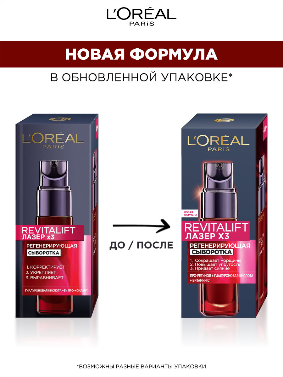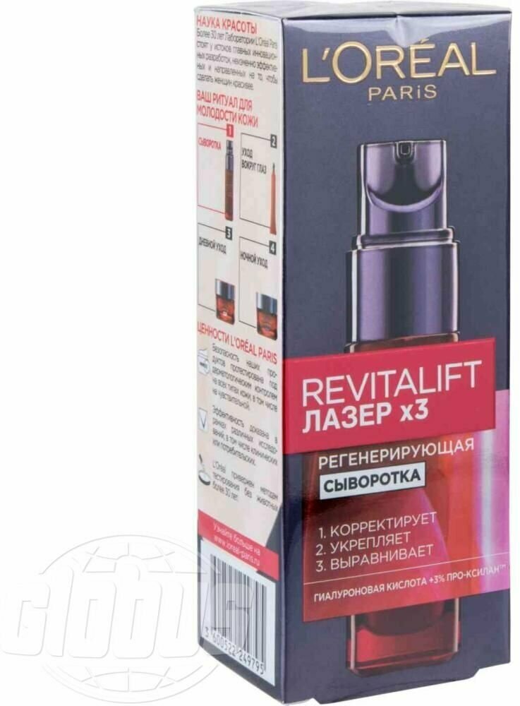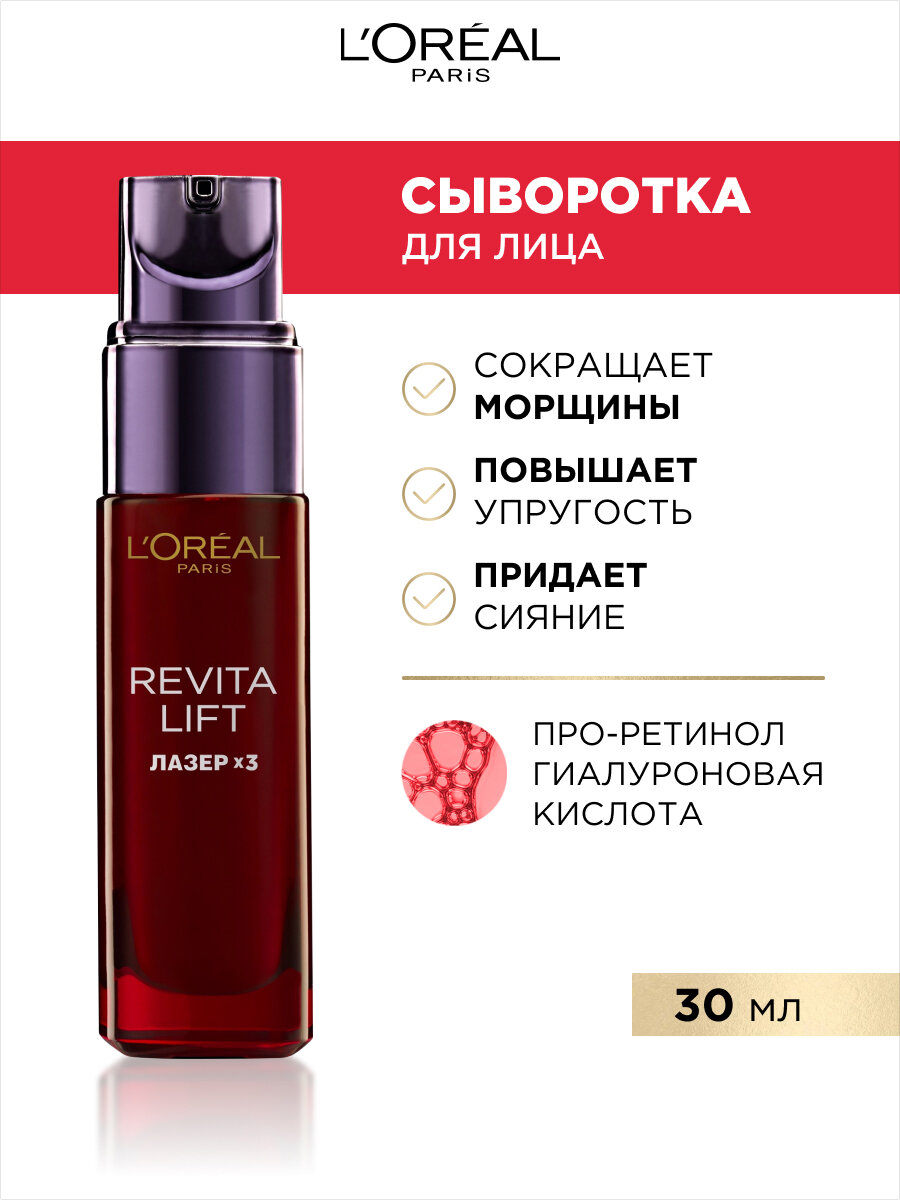 «Revitalift Лазер х3» — антивозрастная сыворотка для лица от Лореаль Париж, входящая в состав фрагментированная гиалуроновая кислота разглаживает морщины, Про-Ксилан отвечает за повышение упругости кожи и восстановлению контуров лица, а Про-Керамид и LAH-уход сужают поры. При ежедневном использовании в течение месяца кожа становится более упругой, морщины заметно сокращаются, поры сужаются.