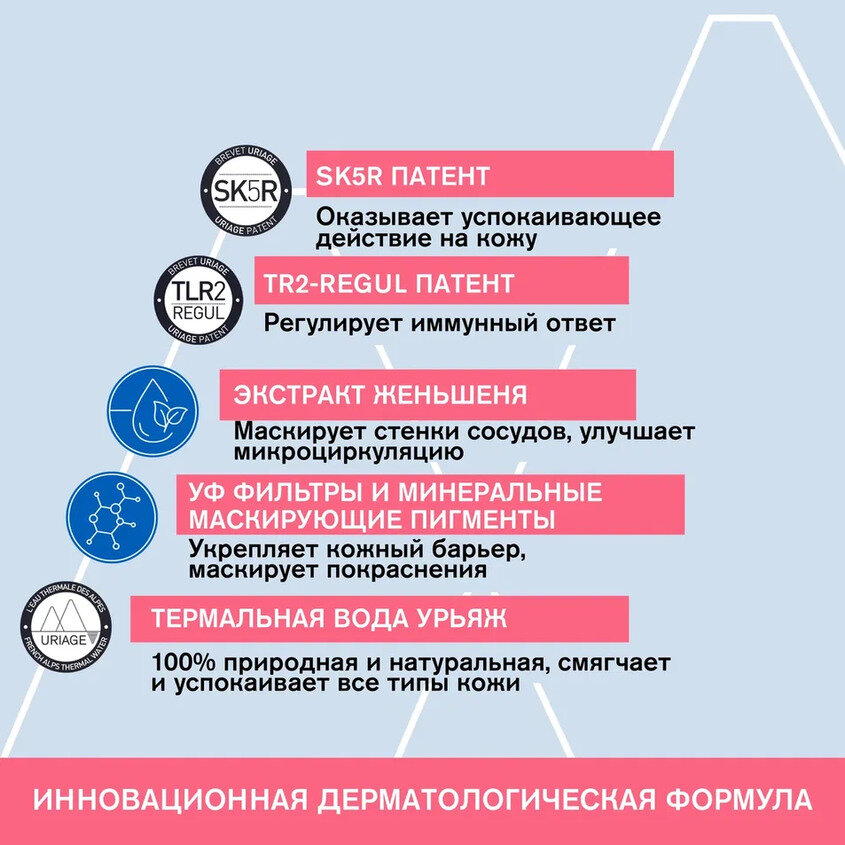 | Активные компоненты | Запатентованный комплекс TLR2-Regul на ранних этапах останавливает воспалительные реакции, вызванные присутствием микроорганизмов, в частности, Демодексом. Термальная вода Урьяж + патент Церастерол-2F успокаивают и укрепляют кожный барьер. Экстракт женьшеня. Минеральные пигменты, UVA+UVB Фильтры |