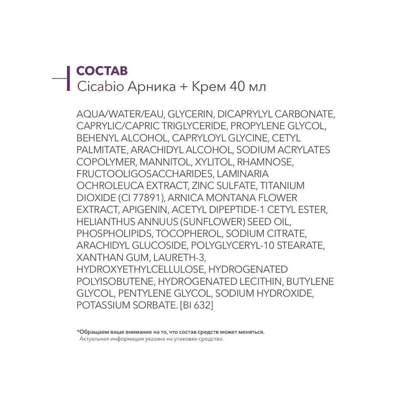 Состав (без парабенов, отдушек и искусственных красителей): aqua/water/eau, glycerin, dicaprylyl carbonate, caprylic/capric triglyceride, propylene glycol, behenyl alcohol, capryloyl glycine, cetyl palmitate, arachidyl alcohol, sodium acrylates copolymer, mannitol, xylitol, rhamnose, fructooligosaccharides, laminaria ochroleuca extract, zinc sulfate, titanium dioxide (ci 77891), arnica montana flower extract, apigenin, acetyl dipeptide-1 cetyl ester, helianthus annuus (sunflower) seed oil, phospholipids, tocopherol, sodium citrate, arachidyl glucoside, polyglyceryl-10 stearate, xanthan gum, laureth-3, hydroxyethylcellulose, hydrogenated polyisobutene, hydrogenated lecithin, butylene glycol, pentylene glycol, sodium hydroxide, potassium sorbate. [bi 632]