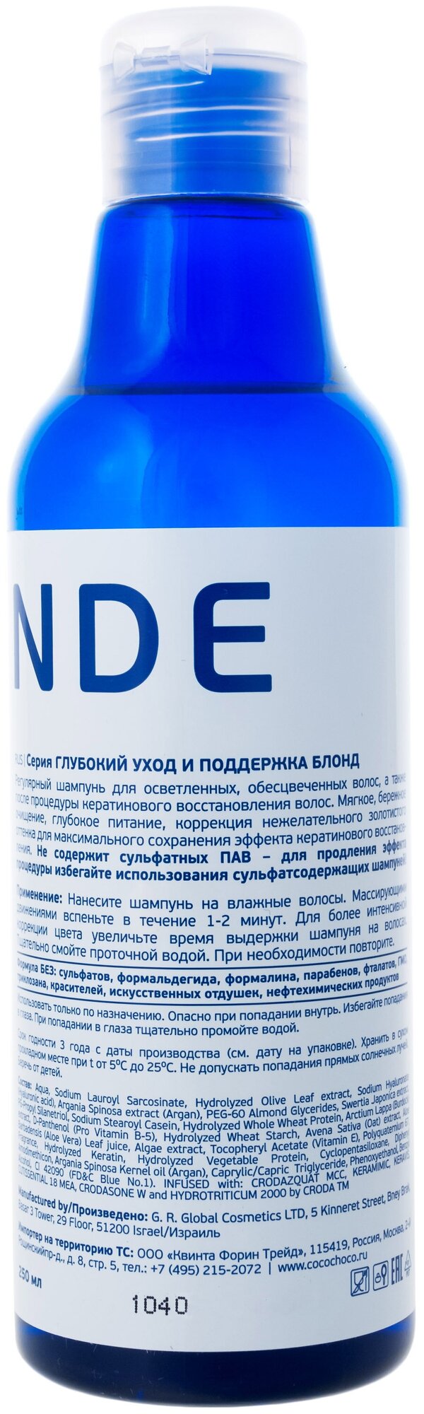 Регулярный шампунь для осветленных, обесцвеченных волос, а также после процедуры кератинового восстановления. Мягкое, бережное очищение, глубокое питание, поддержка холодных оттенков блонд. Снижает ломкость и хрупкость волос, вызванную химическими воздействиями. Максимально сохраняет результат кератинового восстановления волос на пористых, осветленных волосах.