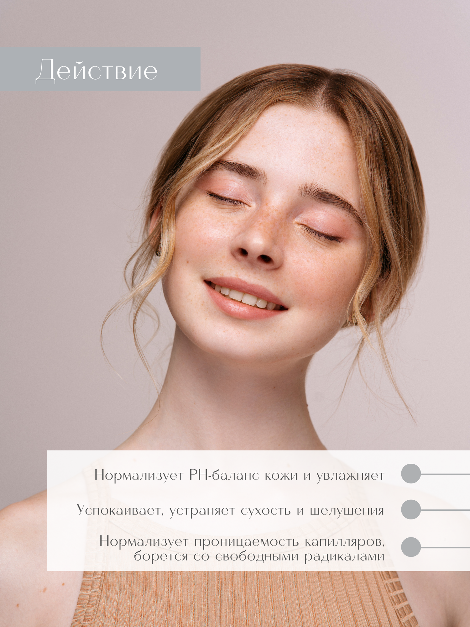 Нормализует проницаемость капилляров, делает менее заметной сосудистую сетку, обладает успокаивающим эффектом, антиоксидантный эффект, улучшает проникновение средств интенсивного ухода.