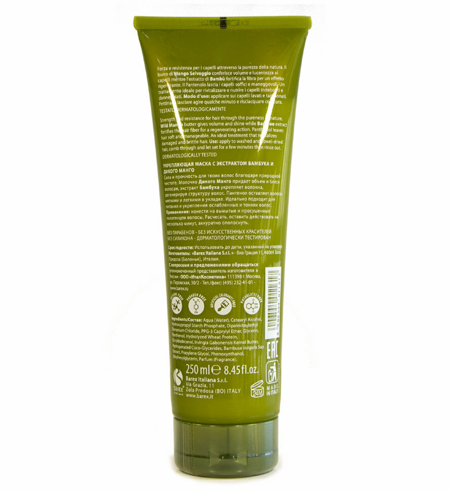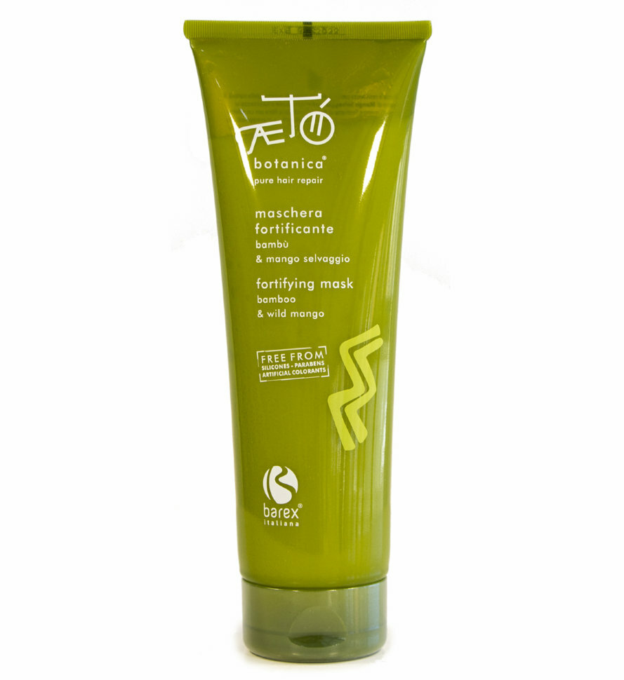 Маска укрепляющая с экстрактом бамбука и дикого манго Barex Italiana Aeto Fortifying Mask in tub Bamboo & Wild Mango рекомендуется для шокового воздействия на особенно ослабленные, химически обработанные и обезвоженные волосы. Полученное из фруктов дикого манго, так называемое ""ботаническое масло"", содержащее триглицериды и токоферол, придает волосам объем и блеск, улучшает расчесываемость. Экстракт бамбука и пантенол делают эту маску особо питательной и восстанавливающей, идеальной для всех типов истощенных и ослабленных волос. Благодаря физиологическом рН маска хорошо распутывает волосы, не утяжеляя их.