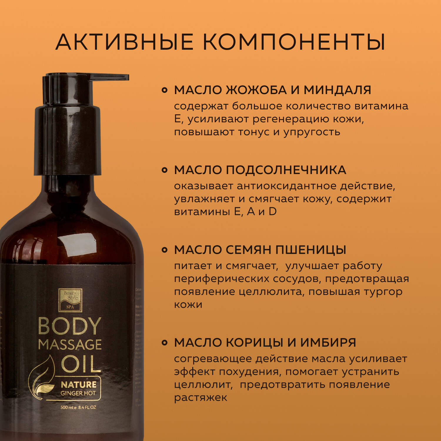 Имбирное масло с разогревающим эффектом Beauty Style дает отличное скольжение, улучшает работу кровеносных сосудов, обладает детоксицирующим действием, снимает спазм мышц и усталость, питает и увлажняет кожу. Масло оптимально для проведения ручного, лимфодренажного и вакуумного массажа. Активные компоненты масла обеспечивают многостороннее действие: Масло подсолнечника оказывает антиоксидантное и антисептическое действие, увлажняет и смягчает кожу, содержит витамины E, A и D, сохраняет уровень увлажнения кожи. Масла жожоба и миндаля содержат большое количество витамина Е, что определяет их способность усиливать регенерацию кожи, повышать тонус и упругость, уменьшать эффект апельсиновой корки. Масло семян пшеницы питает и смягчает, а при интенсивном массаже улучшает работу периферических сосудов, предотвращая появление целлюлита, повышая тургор кожи. Масла корицы и имбиря дарят массажному маслу тонкие пряные ароматы, усиливают периферическое кровообращение, производят разогревающий эффект. Согревающее действие масла усиливает эффект похудения, помогает устранить целлюлит, предотвратить появление растяжек. Корица также успокаивает кожу, снимает покраснение и раздражение, уменьшает шелушение.