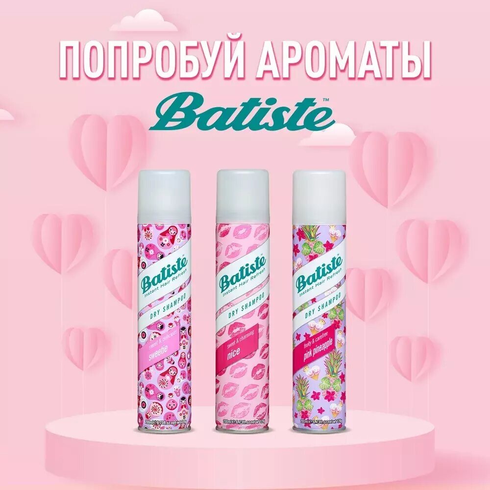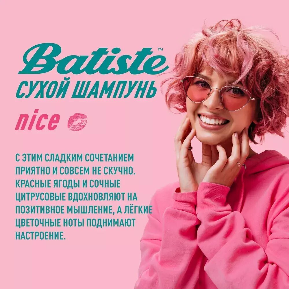 Batiste Nice – сухой шампунь с ароматом грейпфрута, дыни и яблок, с цветочной сладостью розы, фрезии и тонкими нотами кедра и мускуса, предназначенный для быстрого придания волосам свежести, объема и структурности. Его действие не отличаются от оригинального шампуня, но это настоящая находка для тех, кто особенно трепетно относится к запахам и любит порадовать себя новыми сочетаниями.