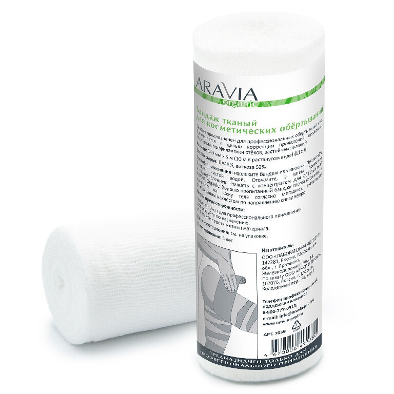 | Применение | извлеките бандаж из упаковки. Пропитайте бандаж чистой водой. Отожмите, а затем поместите в подготовленную ёмкость с концентратом для обёртывания ARAVIA Organic. Хорошо пропитанный бандаж слегка отожмите и нанесите на кожу тела согласно методике, наматывая с небольшим нахлёстом по направлению снизу вверх |
