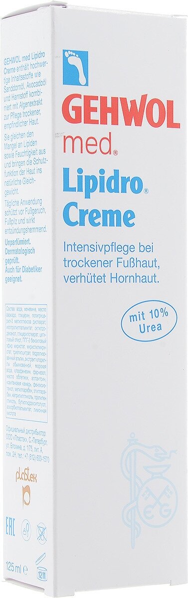 | Полное описание | Крем Гидро-баланс (Gehwol med Lipidro Cream) создан для оптимального ухода за сухой и особо чувствительной кожей. Высокоэффективные материалы, содержащиеся в этом средстве, выравнивают недостаток липидов, а также влаги, и приводят в равновесие естественные защитные функции кожи. Активные вещества связывают воду в более глубоких слоях кожи. Ее огрубевшие участки размягчаются, а также уменьшается их образование снова.Масло облепихи и масло авокадо с их высоким содержанием ненасыщенных жирных кислот доставляют сухой коже недостающие липиды, и уменьшают количество воды, выделяющейся с потом и испарением. Эта защитная функция поддерживается специальным экстрактом из водорослей. Вещество аллантоин, содержащееся в конском каштане, содействует регенерации кожи. Масло папоротника выполняет роль антибактериального и дезодорирующего компонента.Ежедневное применение Крема Гидро-баланс Геволь мед (Gehwol med Lipidro Cream) защищает ноги от возникновения неприятных запахов, грибковых поражений стопы и действует как противовоспалительное средство. Не содержит ароматизирующих добавок.Проверено по дерматологическим показателям. Благоприятно применение при заболевании диабетом.Активные компоненты: глицерин, масло облепихи, масло авокадо, масло папоротника, экстракт морских водорослей, аллантоин.Применение: наносить ежедневно утром и / или вечером на чистую сухую кожу стоп и икр. Массировать до полного впитывания. Рекомендуется для ухода за диабетической стопой.Объем |