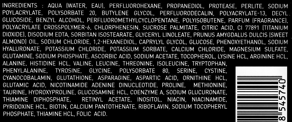 Состав: aqua (water, eau), perfluorohexane, propanediol, protease, perlite, sodium poylacrylate, polysorbate 20, butylene glycol, perfluorodecalin, polyacrylate-13, decyl glucoside, benzyl alcohol, perfluoromethylcyclopentane, polyisobutene, parfum (fragrance), polyacrylate crosspolymer-6, chlorphenesin, sucrose palmitate, citric acid, ci 77891 (titanium dioxide), disodium edta, sorbitan isostearate, glyceryl linoleate, prunus amygdalus dulcis (sweet almond) oil, sodium chloride, 1,2-hexanediol, caprylyl glycol, glucose, phenoxyethanol, sodium hyaluronate, potassium chloride, potassium sorbate, calcium chloride, magnesium sulfate, glutamine, sodium phosphate, ascorbic acid, sodium acetate, tocopherol, lysine hcl, arginine hcl, alanine, histidine hcl, valine, leucine, threonine, isoleucine, tryptophan, phenylalanine, tyrosine, glycine, polysorbate 80, serine, cystine, cyanocobalamin, glutathione, asparagine, aspartic acid, ornithine hcl, glutamic acid, nicotinamide adenine dinucleotide, proline, methionine, taurine, hydroxyproline, glucosamine hcl, coenzyme a, sodium glucuronate, thiamine diphosphate, retinyl acetate, inositol, niacin, niacinamide, pyridoxine hcl, biotin, calcium pantothenate, riboflavin, sodium tocopheryl phosphate, thiamine hcl, folic acid