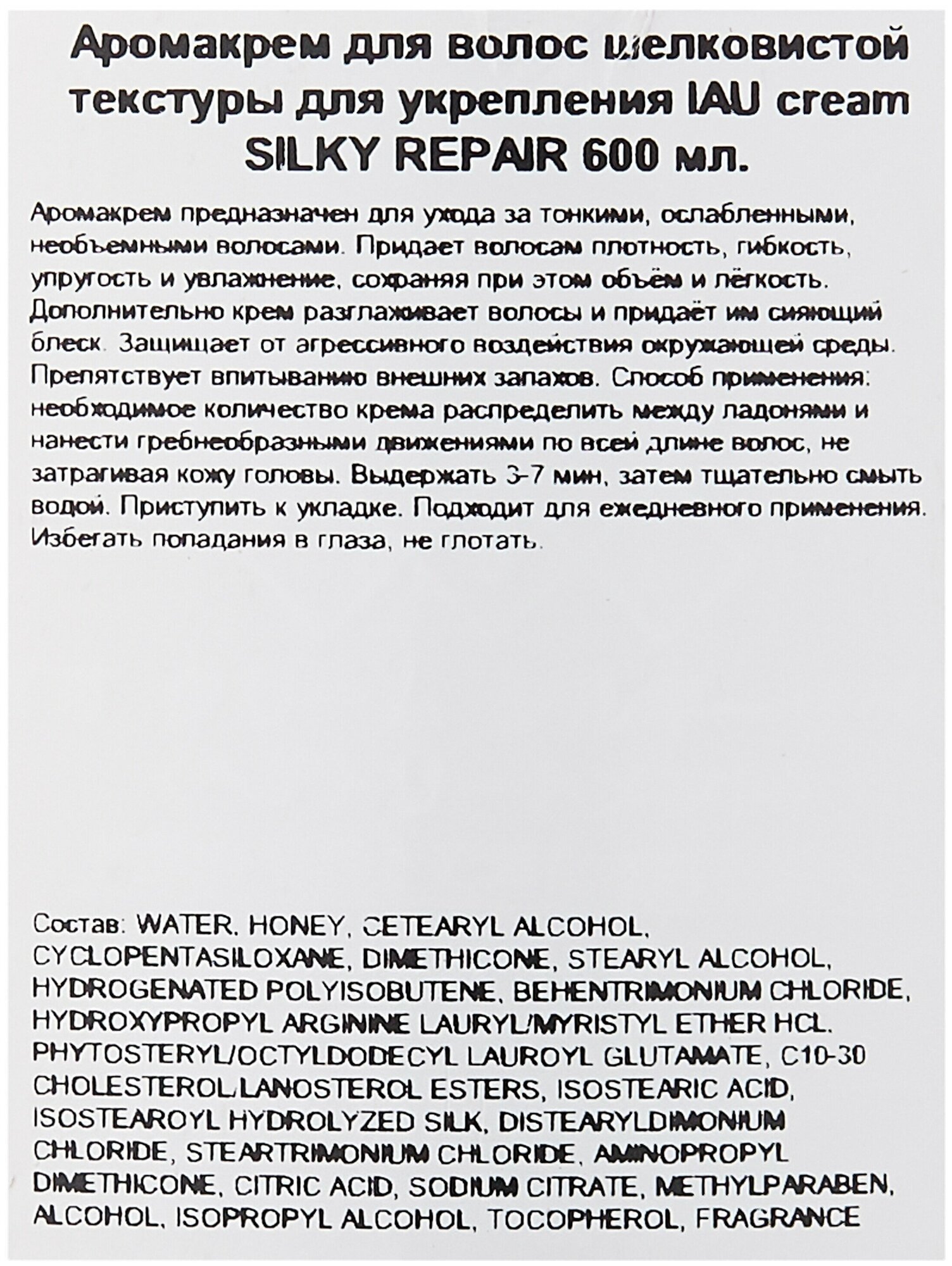 Состав: water, honey, cetearyl alcohol, cyclopentasiloxane, dimethicone, stearyl alcohol, hydrogenated polyisobutene, behentrimonium chloride, hydroxypropyl arginine lauryl/myristyl ether hcl, phytosteryl/octyldodecyl lauroyl glutamate, с10-30 cholesterol/lanosterol esters, isostearic acid, isostearoyl hydrolyzed silk, distearyldimonium chloride, steartrimonium chloride, aminopropyl dimethicone, citric acid, sodium citrate, methylparaben, alcohol, isopropyl alcohol, tocopherol, fragrance.