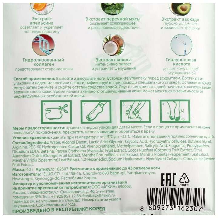 Вымойте и высушите ноги. Встряхните упаковку перед вскрытием. Достаньте из упаковки и наденете носочки на ноги, зафиксируйте при помощи специального стикера. Оставьте на 60-90 минут, затем снимите и смойте остатки средства водой. Спустя четыре-пять дней начнется отшелушивание верхних слоев кожи.