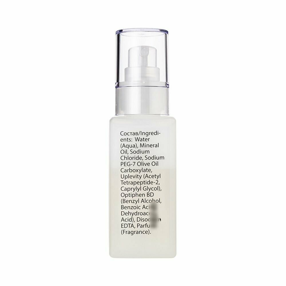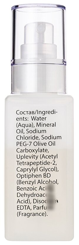 Состав: Вода, минеральное масло, натрия хлорид, ПЭГ-7 эфиры оливкового масла, meiritage (экстракт астрагала перепончатого, экстракт володушки серповидной, экстракт атрактилоидеса крупноголового), juvinity (каприлик каприк триглицерид, геранилгеранилизопропанол), lipomoist 2036 1 (ксантановая камедь, пектин, гидролизованный растительный протеин, серин, аргинин, пролин, эдта натрия), unitamuron h-22 (экстракт тамаринда индийского), novhyal biotech g (ацетил глюкозамин фосфат динатрия), консервант optifen bd, каффеил глюкозид, эдта натрия, парфюмерная композиция.