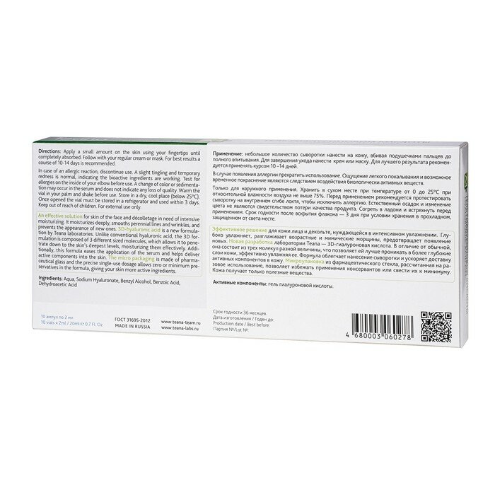 Сервис сравнения цен СкидкаГИД предлагает сравнить цены на товар «Teana Ампулированная сыворотка для лица А4 "Гель гиалуроновой кислоты" 10х2 мл (Teana ) (TEA1009)»