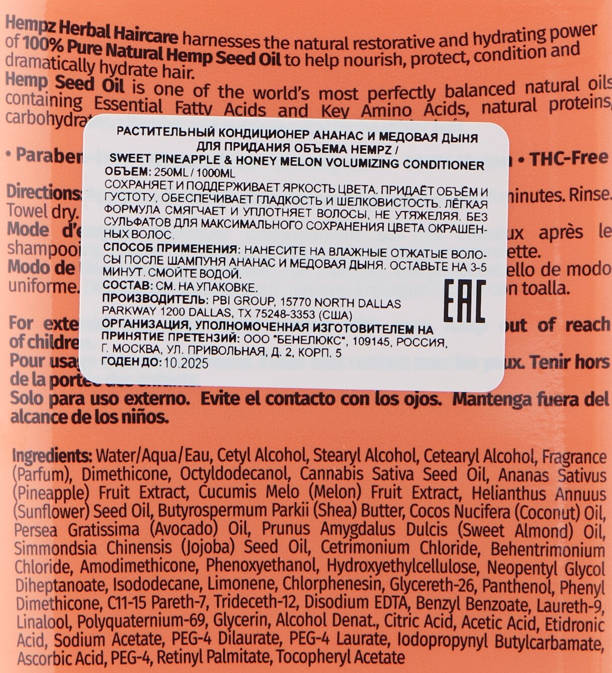 Состав: water/aqua/eau, cetyl alcohol, stearyl alcohol, cetearyl alcohol, fragrance (parfum), dimethicone, octyldodecanol, cannabis sativa seed oil, ananas sativus (pineapple) fruit extract, cucumis melo (melon) fruit extract, helianthus annuus (sunflower) seed oil, butyrospermum parkii (shea) butter, cocos nucifera (coconut) oil, persea gratissima (avocado) oil, prunus amygdalus dulcis (sweet almond) oil, simmondsia chinensis (jojoba) seed oil, cetrimonium chloride, behentrimonium chloride, amodimethicone, phenoxyethanol, hydroxyethylcellulose, neopentyl glycol diheptanoate, isododecane, limonene, chlorphenesin, glycereth-26, panthenol, phenyl dimethicone, c11-15 pareth-7, trideceth-12, disodium edta, benzyl benzoate, laureth-9, linalool, polyquaternium-69, glycerin, alcohol denat., citric acid, acetic acid, etidronic acid, sodium acetate, peg-4 dilaurate, peg-4 laurate, iodopropynyl butylcarbamate, ascorbic acid, peg-4, retinyl palmitate, tocopheryl acetate