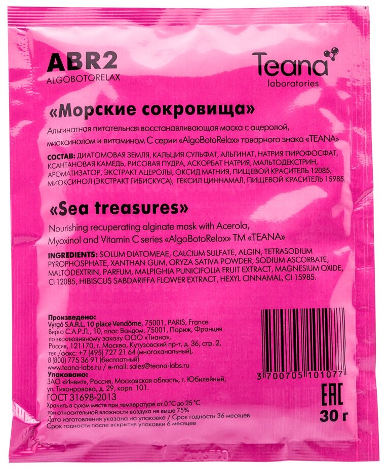 Teana Альгинатная Восстанавливающая маска «Морские сокровища» 30х5 гр (Teana ) (TEAABR2)
