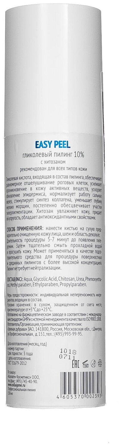 Гликолевый пилинг для лица Easy Peel с хитозаном на основе гликолевой кислоты 10% (pH 2,8) обладает очень мягким воздействием на кожу.