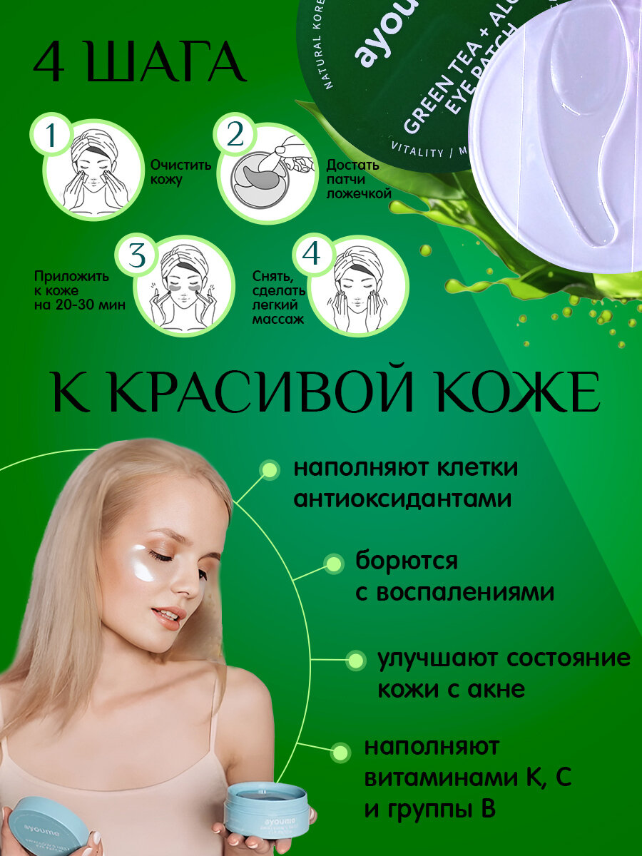 Патчи из высококачественного гидрогеля предназначены для интенсивного увлажняющего и успокаивающего ухода за кожей области глаз. Патчи помогают уменьшить отёчность и тёмные круги, повышают упругость и эластичность кожи, а также служат для профилактики её преждевременного увядания. Гидрогель делает патчи очень эффективным средством по уходу за кожей в области глаз. Максимально плотное прилегание к коже обеспечивает максимально глубокое проникновение активных компонентов. Экстракты зелёного чая и алоэ оказывают интенсивное увлажняющее, успокаивающее и смягчающее воздействие, обладают противовоспалительными и заживляющими свойствами, устраняют шелушения и сухость, улучшают микроциркуляцию крови и уменьшают отёчность. Благодаря содержанию мощных антиоксидантов патчи защищают от негативного воздействия ультрафиолета, свободных радикалов, предупреждают преждевременное старение. При регулярном применении патчей кожа вокруг глаз становится упругой и эластичной, сеточка морщин разглаживается, а тёмные круги и отёчность становятся менее выраженными.