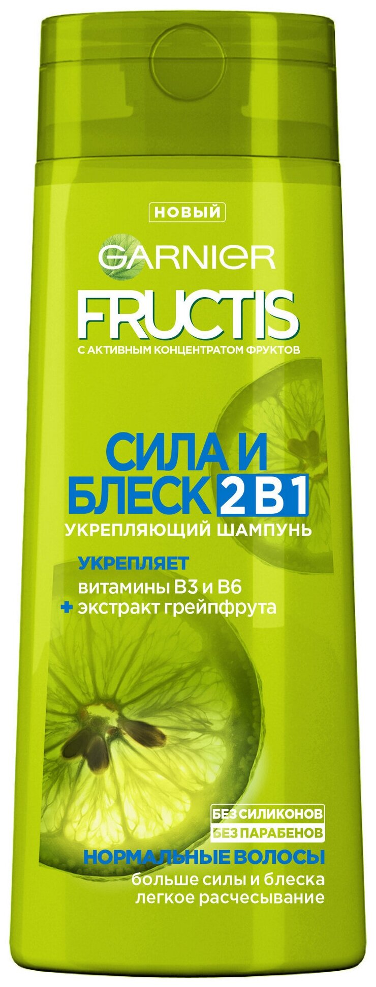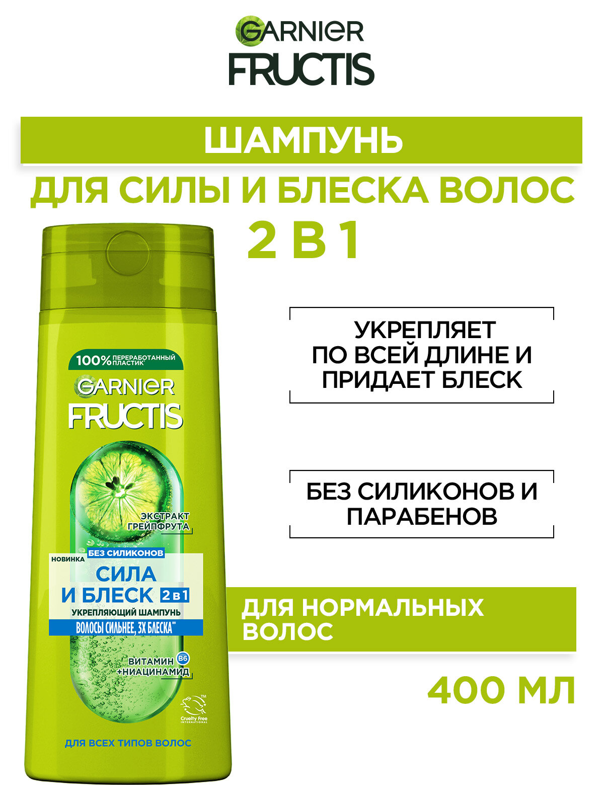 Шампунь 2 в 1 Для нормальных волос Fructis от Garnier создан специально для нормальных волос. Шампунь наполняет волосы живительной силой и энергией от самых корней и до кончиков, а так же укрепляет волосы изнутри. Обеспечивает легкое расчесывание волосы без спутывания.