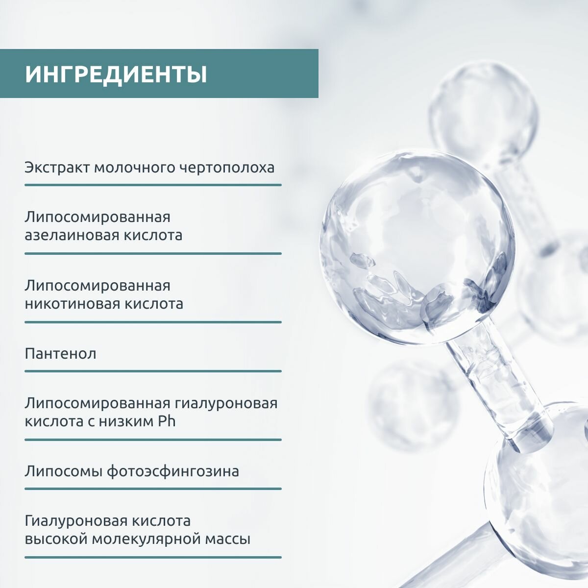 - высоко- и низкомолекулярная липосомированная гиалуроновая кислота мгновенно увлажняет кожу, повышает ее эластичность и разглаживает морщины