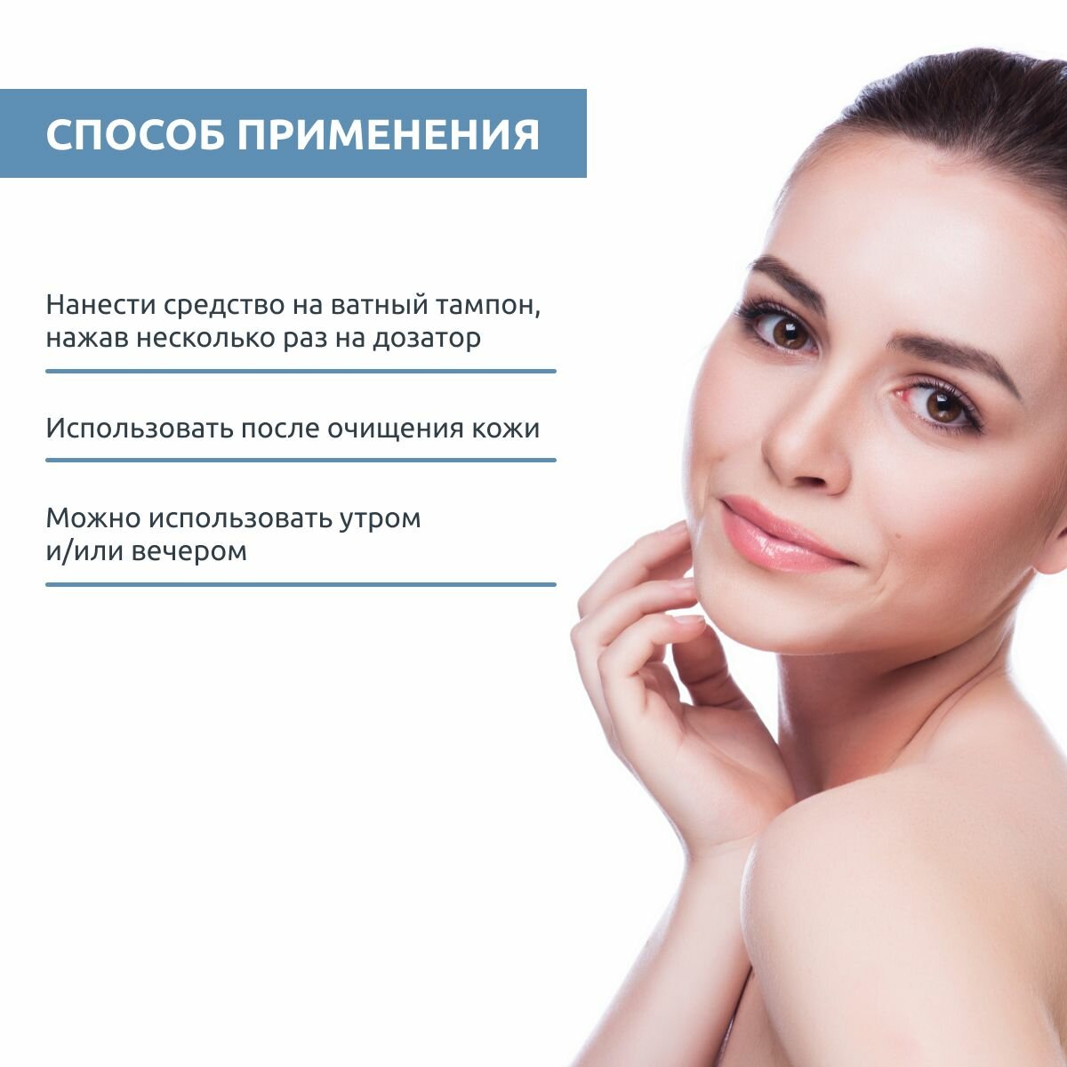 Нанести средство на ватный диск, нажав несколько раз на дозатор. Протереть заранее очищенную кожу. Можно использовать утром и/или вечером.