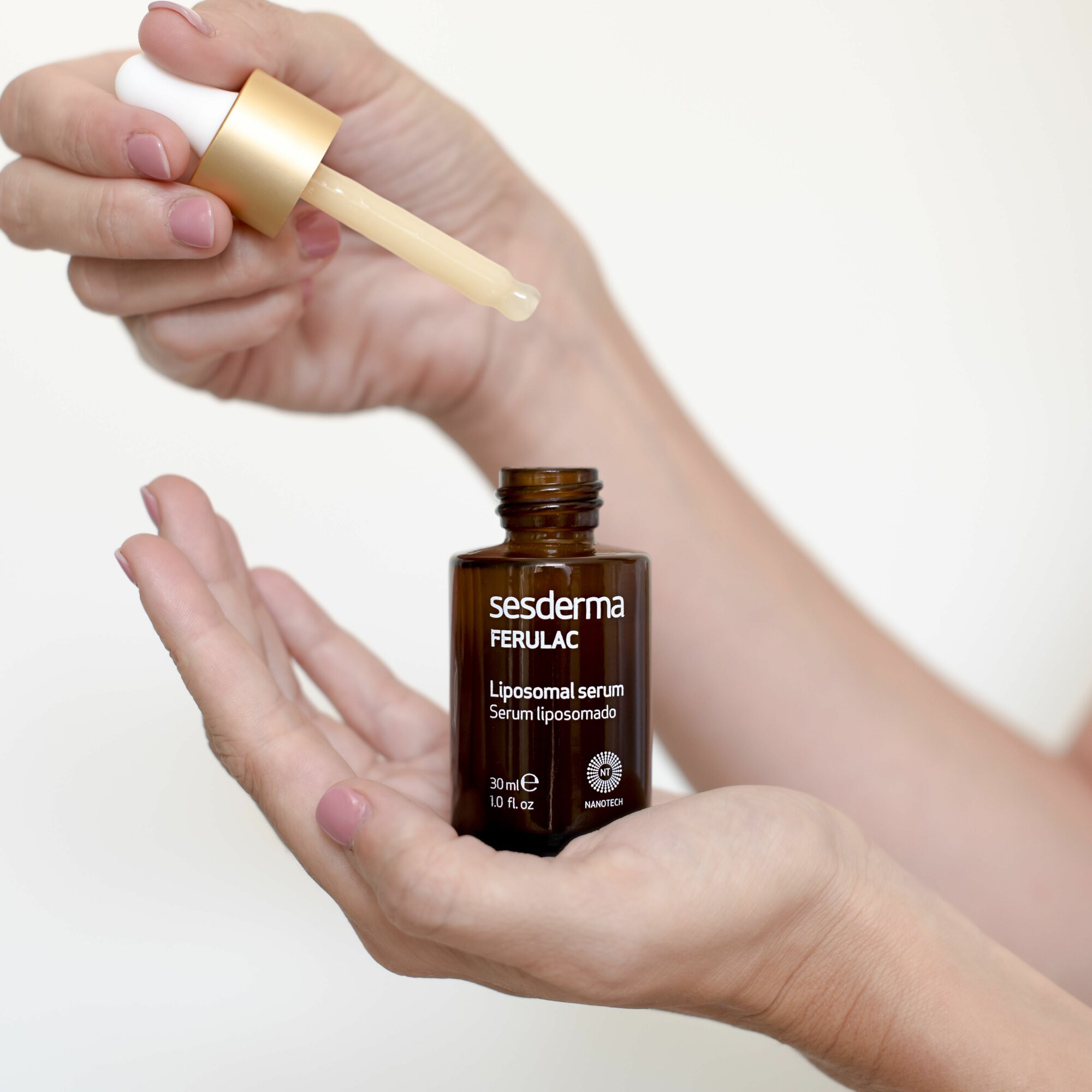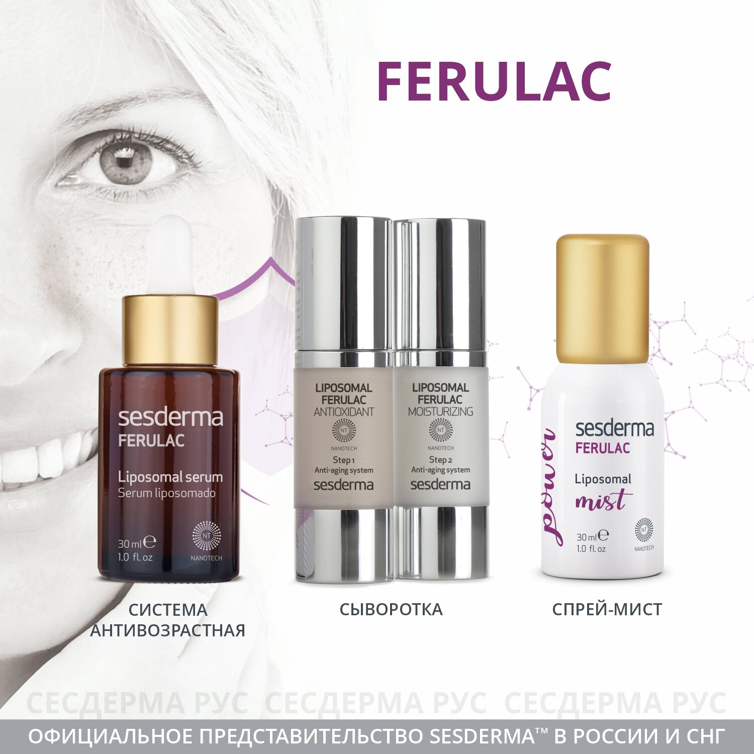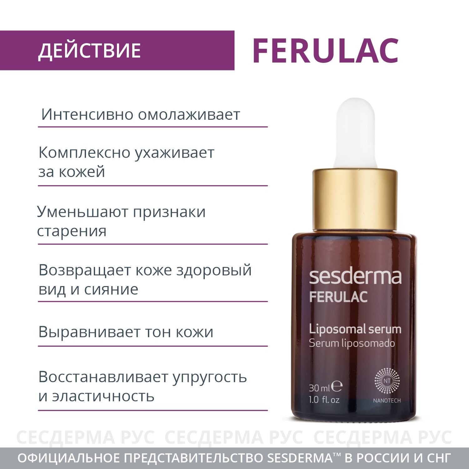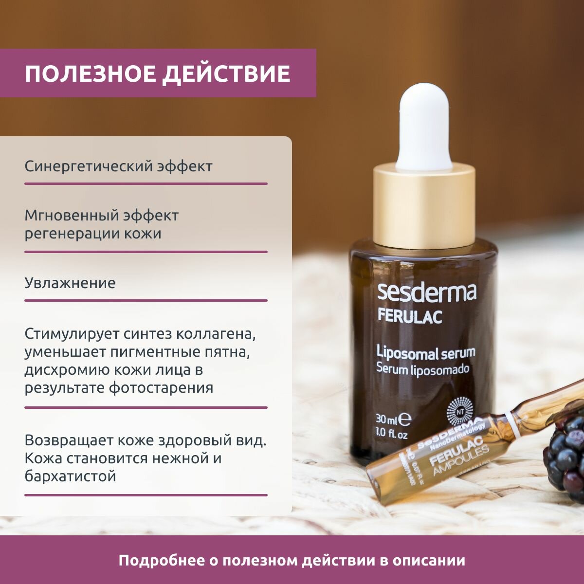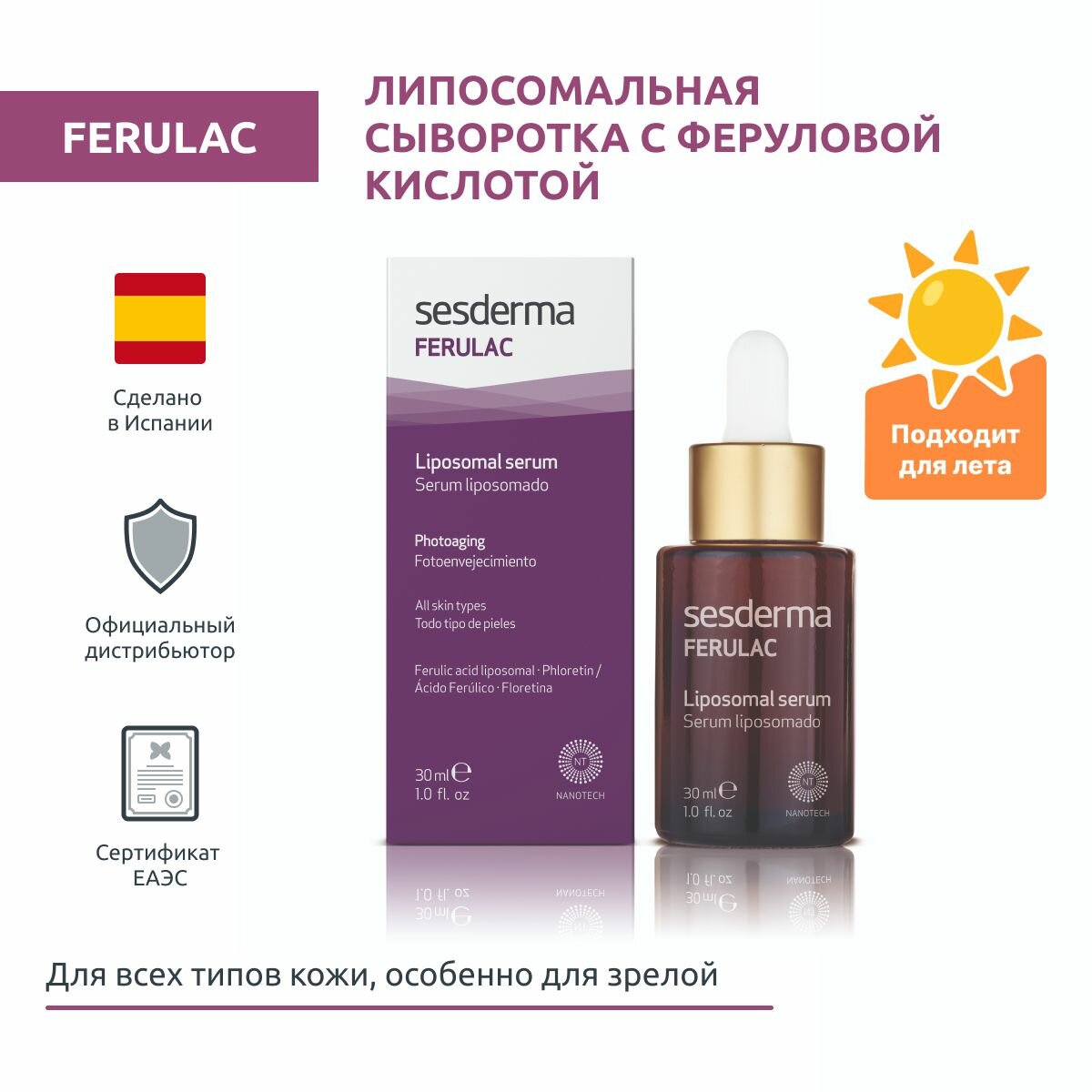 Липосомальная сыворотка с феруловой кислотой, витаминами А, Е, С и флоретином возвращает коже здоровый вид и сияние, восстанавливает ее, борется с признаками фотостарения, уменьшает пигментные пятна.