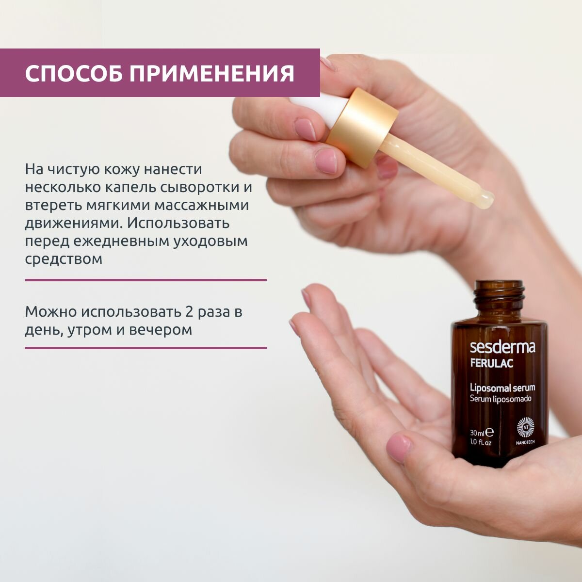 | Применение | на чистую кожу нанести несколько капель сыворотки и втереть мягкими массажными движениями. Использовать перед ежедневным уходовым средством. Можно использовать утром и/или вечером |