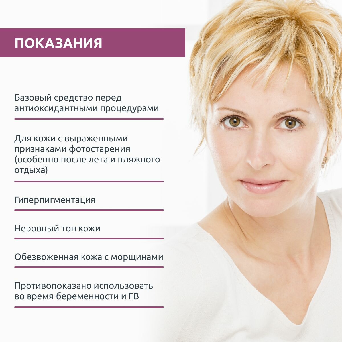 | Назначение | Антиоксидантный уход, Депигментация, Коррекция морщин, Повышение упругости и эластичности, Сияние кожи |
