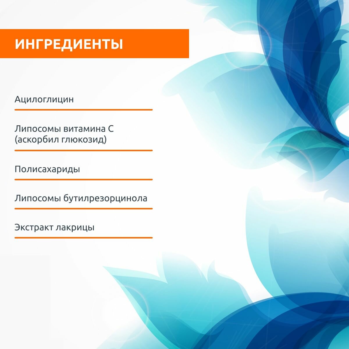 | Активные компоненты | бутилрезорцин - отбеливает, уменьшает пигментацию, обладает бактерицидным действием. витамин С - увлажняет кожу, обеспечивает антиоксидантный эффект, борется с признаками преждевременного старения, отбеливает кожу. азелоглицин - увлажняет кожу, успокаивает, снимает покраснения, препятствует образованию морщин, оказывает депигментирующее действие. пантенол - обладает успокаивающим, противовоспалительным, восстанавливающим и заживляющим эффектом. Состав: aqua, pentylene glycol, glycerin, alpha-glucan oligosaccharide, panthenol, potassium azeloyl, diglycinate, glycyrrhiza glabra root extract, ascorbyl glucoside, 4-butylresorcinol, polyglyceryl-6, caprylate/caprate, polyglyceryl-4 laurate/sebacate, propylene glycol, lecithin, alcohol, disodium, cocoamphodiacetate, disodium edta, polysorbate 20, sodium cholate, sodium hydroxide, sodium chloride, pantolactone, potassium sorbate, sodium benzoate, phenoxyethanol, parfum, ci 17200. |