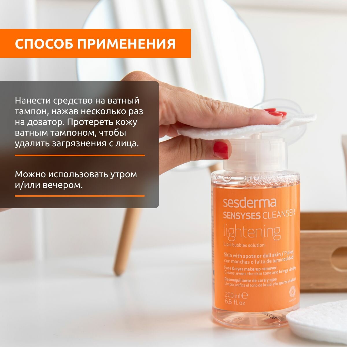Нанести средство на ватный диск, нажав несколько раз на дозатор. Протереть кожу, чтобы удалить загрязнения с лица.