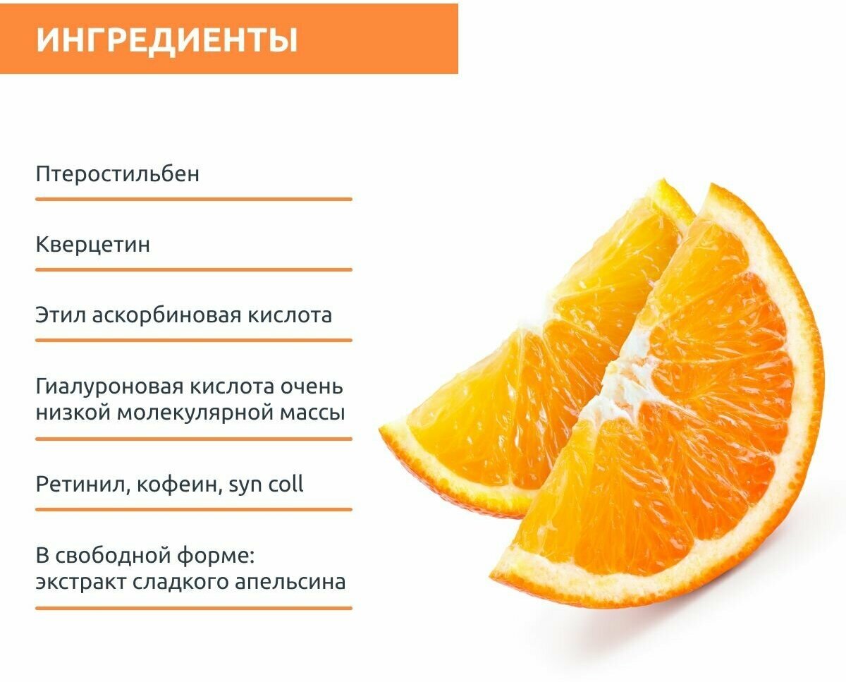 | Активные компоненты | стабилизированный витамин С (e-VIT-C), - инкапсулированный в липосомы, работает как мощный антиоксидант, способствует усиленному синтезу коллагена, сокращает количество морщин и предотвращает их появление, укрепляет кожу и придает ей гладкость и эластичность антиоксидантная система Antiox booster (гингко билоба, птеростильбен, кверцетин) - борется со свободными радикалами, защищают от вредного воздействия окружающей среды, сохраняют молодость кожи. пальмитоил – олигопептид, - который стимулирует кожу на выработку собственного эластина взамен разрушенного, тем самым провоцируя обновление кожи и борясь с ее старением экстракт сладкого апельсина - увлажняет, восстанавливает кожу, способствует выработке коллагена, повышает упругость, выравнивает тон кожи, осветляет низкомолекулярная гиалуроновая кислота - глубоко проникает в кожу и оказывает мощный антивозрастной эффект Состав: aqua, glycerin, propanediol, peg-40 hydrogenated castor oil, ammonium acryloyldimethyltaurate / vp copolymer, propylene glycol, citrus aurantium dulcis fruit extract, ginkgo biloba leaf extract, resveratrol dimethyl ether, caffeine, centella asiatica extract, palmitoyl tripeptide-5, sodium hyaluronate, quercetin, retinyl propionate, tocopheryl acetate, lecithin, alcohol, bht, 3-o-ethyl ascorbic acid, disodium edta, polysorbate 20, triethanolamine, sodium chloride, sodium cholate, retinyl palmitate, sodium hydroxide, tocopherol, helianthus annuus seed oil, phenoxyethanol, ethylhexylglycerin, potassium sorbate, parfum, d-limonene, linalool, citral |