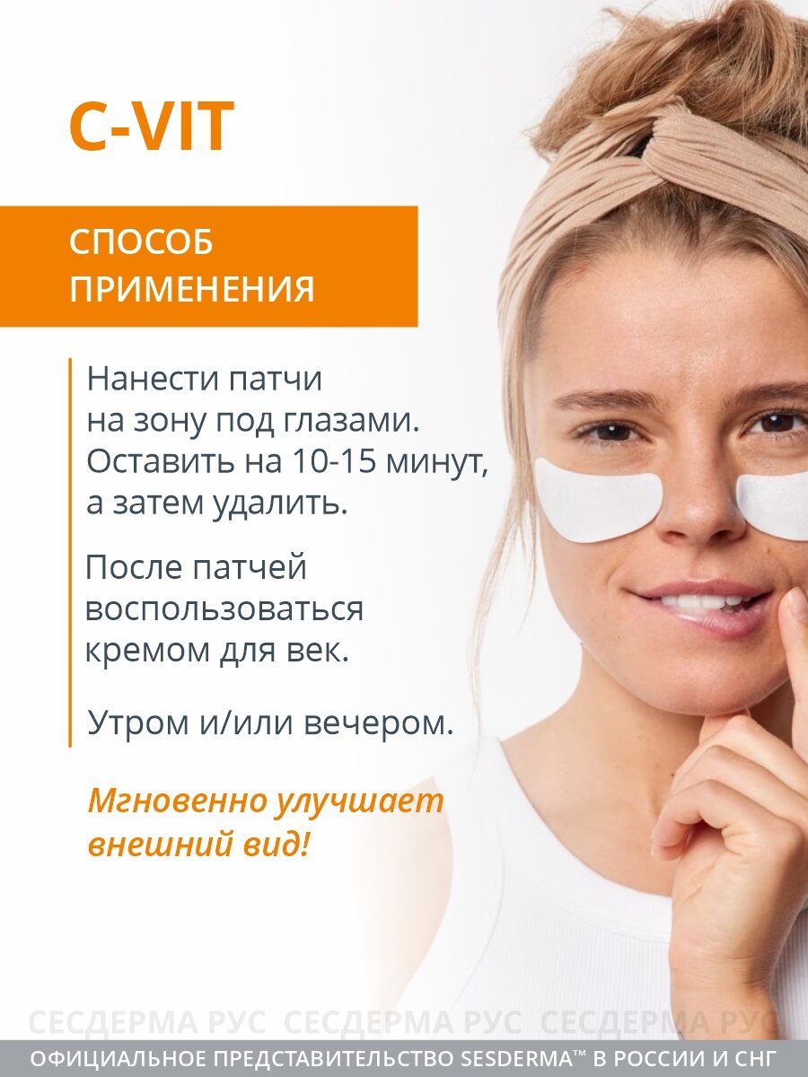 Патчи C-Vit для контура вокруг глаз устраняют признаки усталости и темные круги под глазами, мгновенно улучшают внешний вид, защищают кожу и повышают ее сопротивляемость.