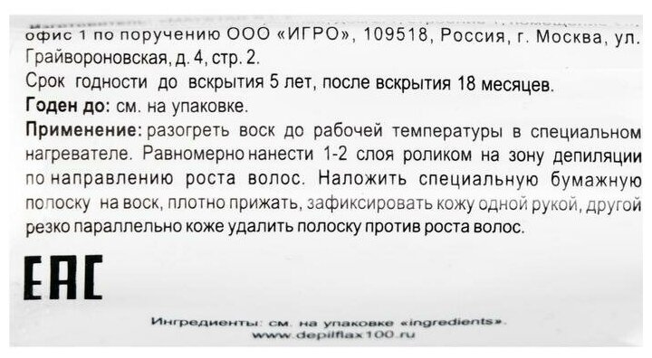 | Способ применения | Вставьте картридж в нагревательный элемент. После нагрева в течение 20 - 30 минут воск готов к использованию. Не вынимайте картридж из нагревательного элемента, обеспечьте воску оптимальную температуру. Проведите роликом по коже вдоль роста волос. Крепко прижмите полоску бумаги для депиляции к нанесенному воску. Натягивая кожу, удалите полоску бумаги для депиляции с воском против роста волос. |