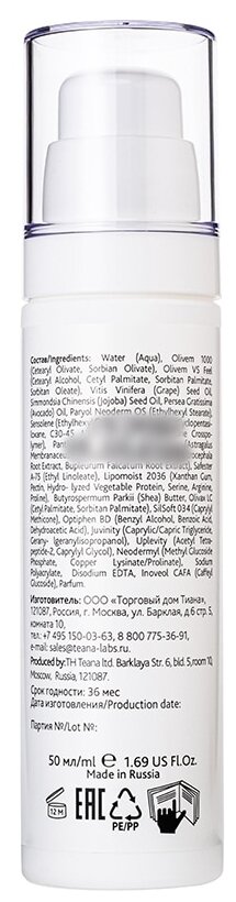 Вода, цетеарил оливат, сорбитан оливат, этил линолеат (витамин f), meiritage (экстракт астрагала перепончатого, экстракт володушки серповидной, экстракт атрактилоидеса крупноголового), цетеариловый спирт, цетил пальмитат, сорбитан пальмитат, сорбитан олеат, этилгексил оливат, масло виноградной косточки, масло авокадо, этилгексил стеарат, масло жожоба, циклопентасилоксан c30-45 полимер алкил цетеарил диметикона, глицерин, гидрогенезированное оливковое масло, оливковое масло, неомыленное оливковое масло, масло ши, каприлил метикон, neodermyl (метил глюкозид медный комплекс лизина и пролина), пантенил триацетат (д-пантенол), lipomoist 2036 1 (ксантановая камедь, пектин, гидролизованный растительный протеин, серин, аргинин, пролин, эдта натрия), juvinity (каприлик/каприк триглицерид, геранилгеранилизопропанол), uplevity (ацетил тетрапептид-2, каприлил гликоль), полиакрилат натрия, консервант optifen bd, парфюмерная композиция, эдта натрия, олейропейнил глюкозид.