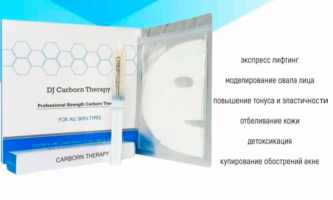 Комплект Carboxy СО2 состоит из геля и маски, когда эти два компонента вступают в контакт друг с другом, образуется углекислый газ. Это эффективная процедура передачи СО2 в кожу лица. После того, как поглощенный в кожу СО2 образует Кислород (О2) от клеток крови до тканей кожи, он вызывает расширение кровеносных сосудов, активирует синтез белка, стимулирует жировой обмен, и выводит шлаки из организма. Косметологические эффекты Carboxy СО2 Gel: улучшение качества и текстуры кожи, СО2 активирует синтез белка, что положительно влияет на тонус кожи, улучшение цвета кожи, СО2 улучшает цвет кожи путем активизации кровообращения и расширения сосудов, омоложение, лифтинг-эффект, улучшение контура лица, СО2 вызывает плотный слой фосфолипидов, который является основным элементом кожи, например, он помогает формированию контура лица, выраженный противовоспалительный и антисептический эффект, способствует быстрому разрешению воспалительных элементов и улучшает местный иммунитет кожи. За счет усиления кровообращения, обмена веществ и синтеза белка, С02 маска помогает устранить растяжки и неровности на поверхности кожи.